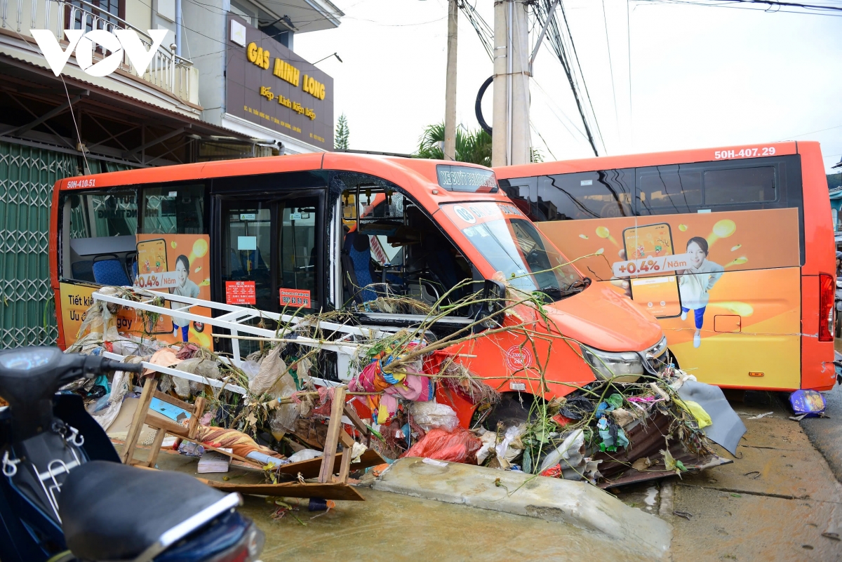 Một số xe khách, xe buýt bị dòng nước lũ cuốn va đập, mắc kẹt cùng bùn đất, rác và cây cối.