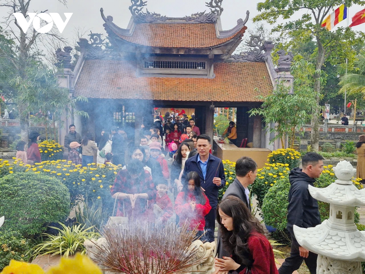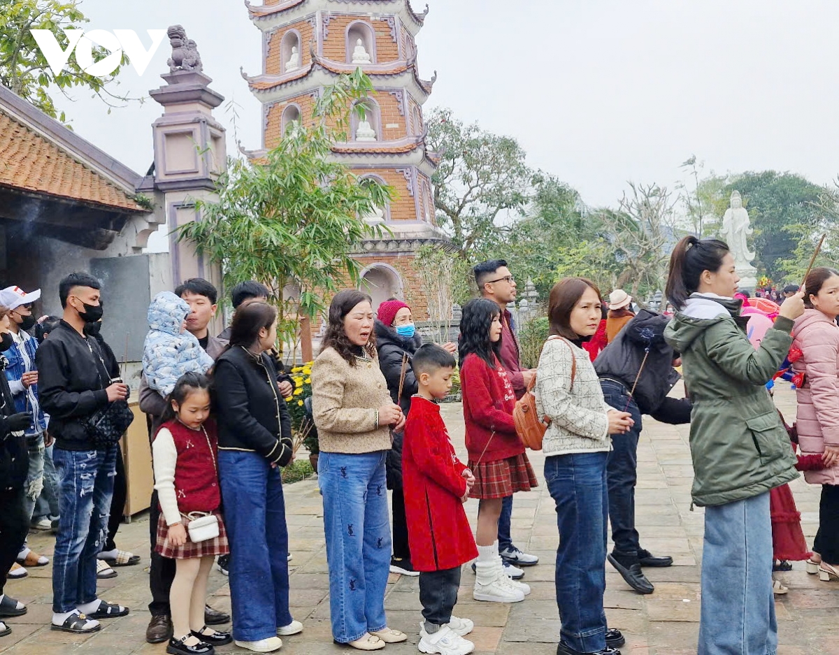 VOV.VN - Hôm nay mùng 2 Tết, trong thời tiết se lạnh, từ sáng sớm, nhiều gia đình ở tỉnh Quảng Bình và khách du lịch đến chùa để dâng hương, cầu năm mới bình an.