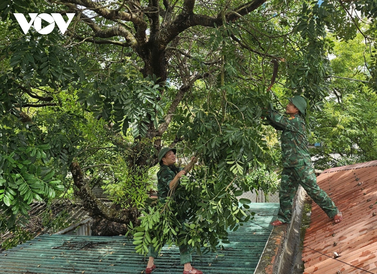 Đồn biên phòng Nhật Lệ hỗ trợ các trường học chặt tỉa cây cao tránh bão