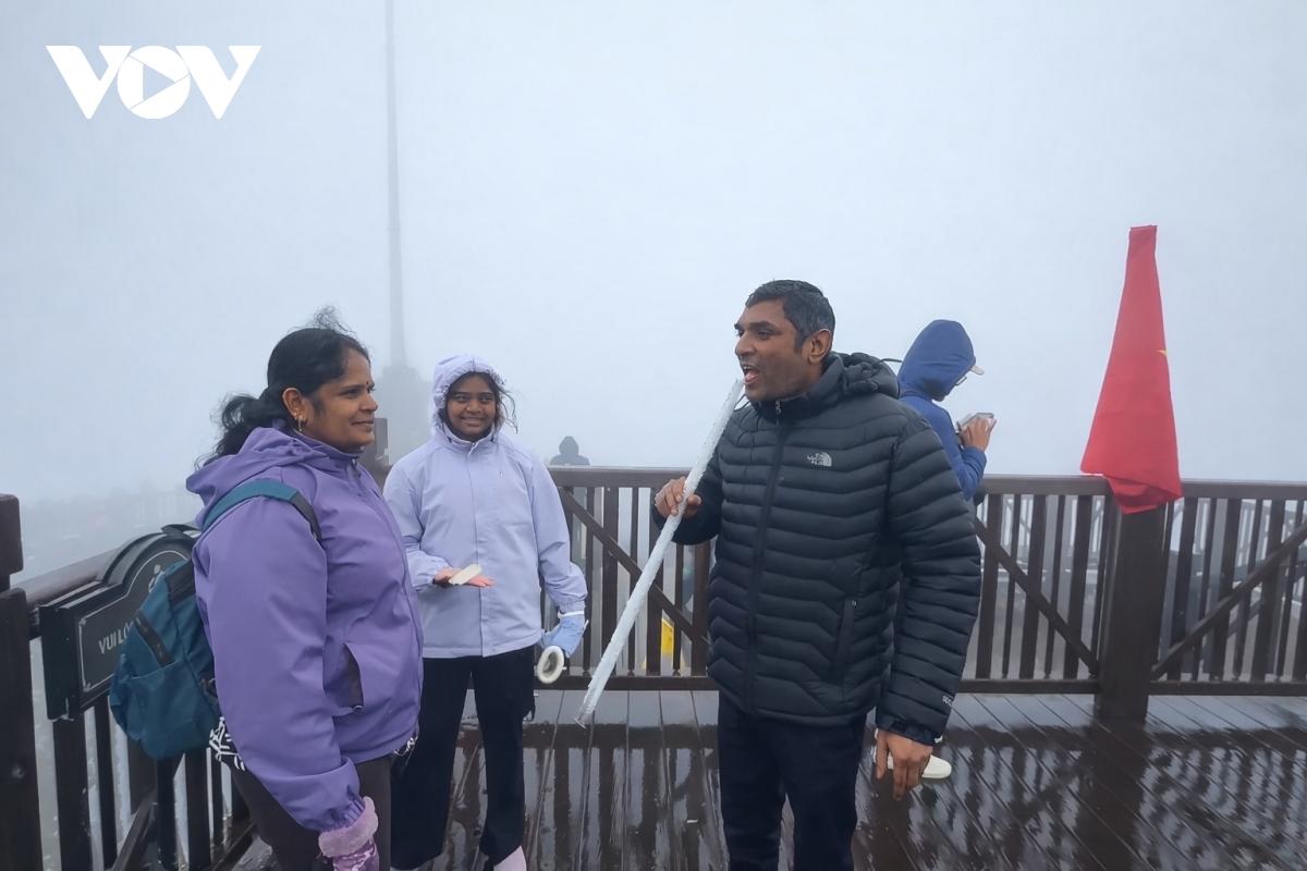 Nhiệt độ xuống âm độ C khiến hơi nước trên đỉnh Fansipan kết thành lớp băng giá trắng xóa. Một du khách đến từ Ấn Độ hào hứng nếm thử "vị" của băng tuyết tại Sa Pa. Với nhiều du khách đến từ xứ nóng, việc được chạm vào, thậm chí nếm thử băng giá tự nhiên là một trải nghiệm "có một không hai".