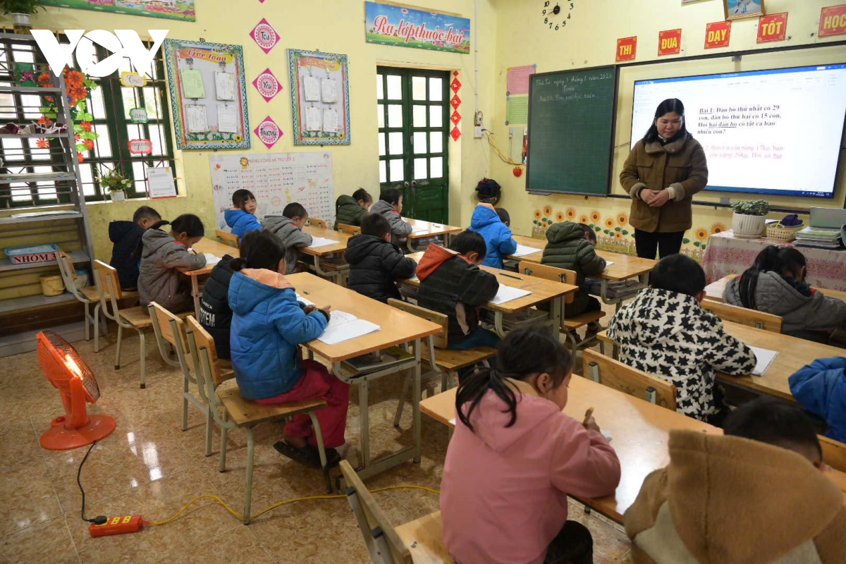 Rời xa cái lạnh ngoài trời, không khí bên trong các trường học tại Sa Pa lại ấm áp lạ thường. Tại các trường học vùng cao như Tiểu học San Sả Hồ 1, những chiếc quạt sưởi được bật liên tục để đảm bảo sức khỏe cho học sinh.