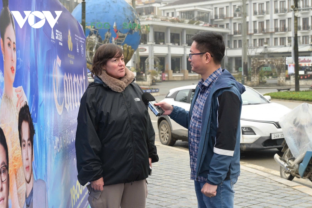 Không chỉ khách nội địa, cái lạnh của Sa Pa còn là trải nghiệm lạ lẫm với du khách quốc tế. Chị Christina, du khách đến từ Tây Ban Nha hào hứng cho biết: "Thời tiết Sa Pa thật tuyệt. Có thể các bạn thấy lạnh, nhưng tôi thì không, tôi thích sự khác biệt này. Ở quê hương tôi lúc này nhiệt độ cao hơn nhiều, khoảng 25 độ C nên tôi thấy khoảng thời gian này tại Sa Pa thật thú vị".