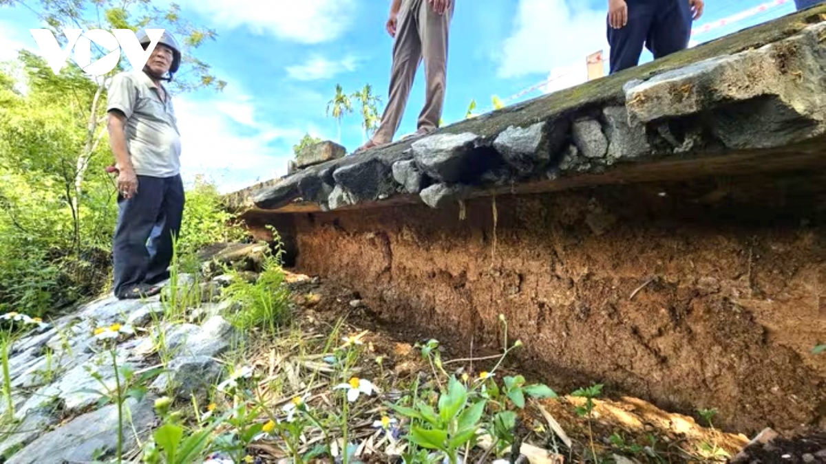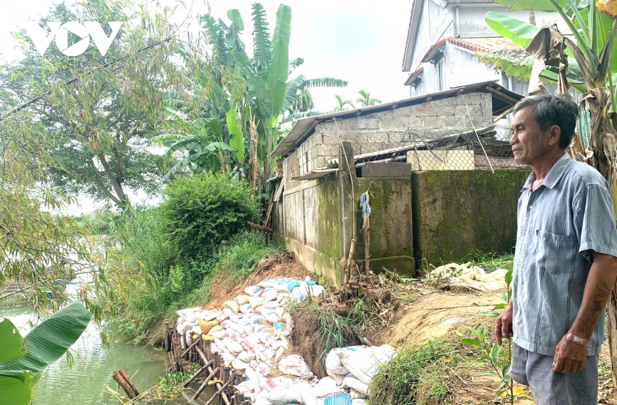 Bà Lê Thị Thanh Tuyên, một người dân sinh sống sát mép sông lo lắng: “Cách đây nửa tháng là mưa to gió lớn gây sạt lở từ dưới bến chùa mà lên thấu bến ALen. Mà sạt lở vô hung rồi, nếu nhà nước không làm kịp, sợ lụt năm ni vô là không khéo bay cả đoạn đường bê tông trước thôn luôn. Bà con sống ở khu vực này là bị nguy hiểm hết”.