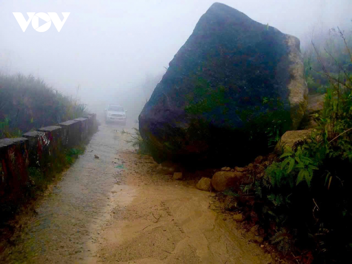 Tại khu vực Măng Liệt, thôn 6, xã Trà Linh (huyện Nam Trà My, tỉnh Quảng Nam cũ), một tảng đá lớn rơi chắn ngang đường khiến xe ô tô không thể lưu thông, đường trơn trượt và sương mù dày đặc làm tăng nguy cơ mất an toàn giao thông.