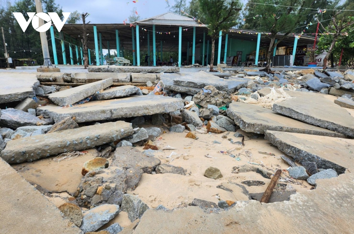 Tại phường Thuận An, sóng lớn và triều cường sau bão số 10 đã cuốn trôi lượng lớn cát, làm biến dạng đoạn đường dạo ven biển dài gần 100 mét lộ những mảng bê tông hư hỏng. Nhiều hàng quán bị cát bồi lấp, tài sản hư hỏng nặng. Hệ thống kè tạm được gia cố trước đây bằng đá hộc, vải lọc và bao tải nay gần như bị phá hủy hoàn toàn. Sau bão, sạt lở ăn sâu vào bờ khoảng 3-4 mét, nhiều ghế đá và hạ tầng công cộng bị sóng đánh gãy, tràn vào khu vực kinh doanh dịch vụ.