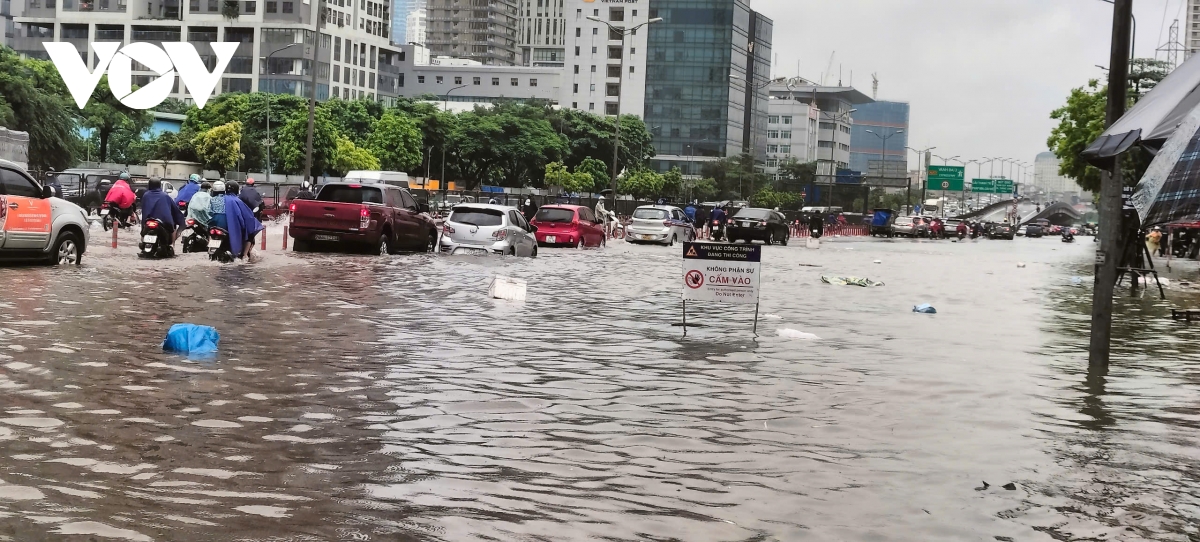 PV Đỗ Hưng/VOV.VN tại Hà Nội ghi nhận tại chân cầu Vĩnh Tuy đoạn trước toà nhà Hoà Bình Green City 505 Minh Khai, phố Mạc Thị Bưởi (phường Vĩnh Tuy), nước ngập sâu nhiều ô tô chết máy, người dân di chuyển hết sức khó khăn.