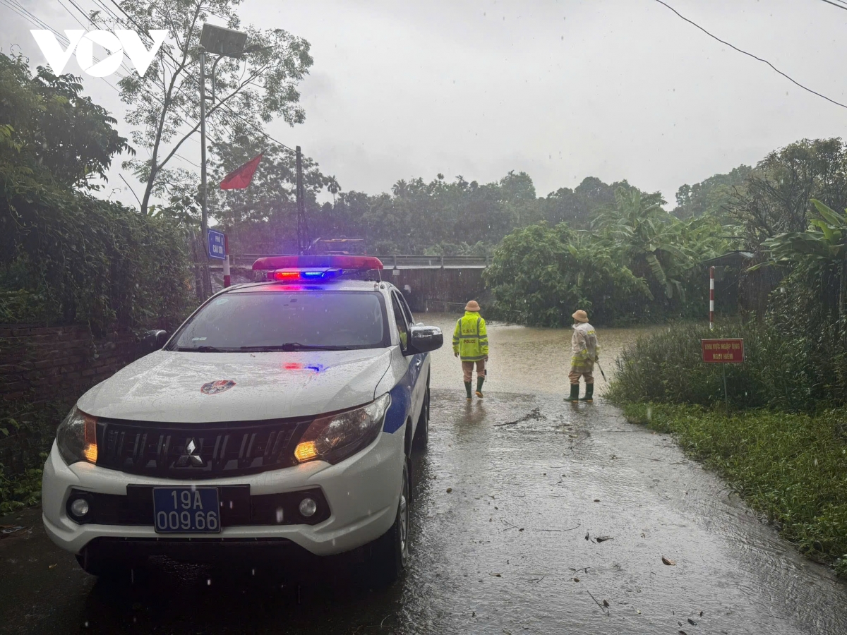Theo phóng viên Phi Long/VOV.VN, nhiều nơi ở Phú Thọ ngập sâu, cử lực lượng canh không cho người và phương tiện qua ngầm tràn khi nước lũ dâng cao.