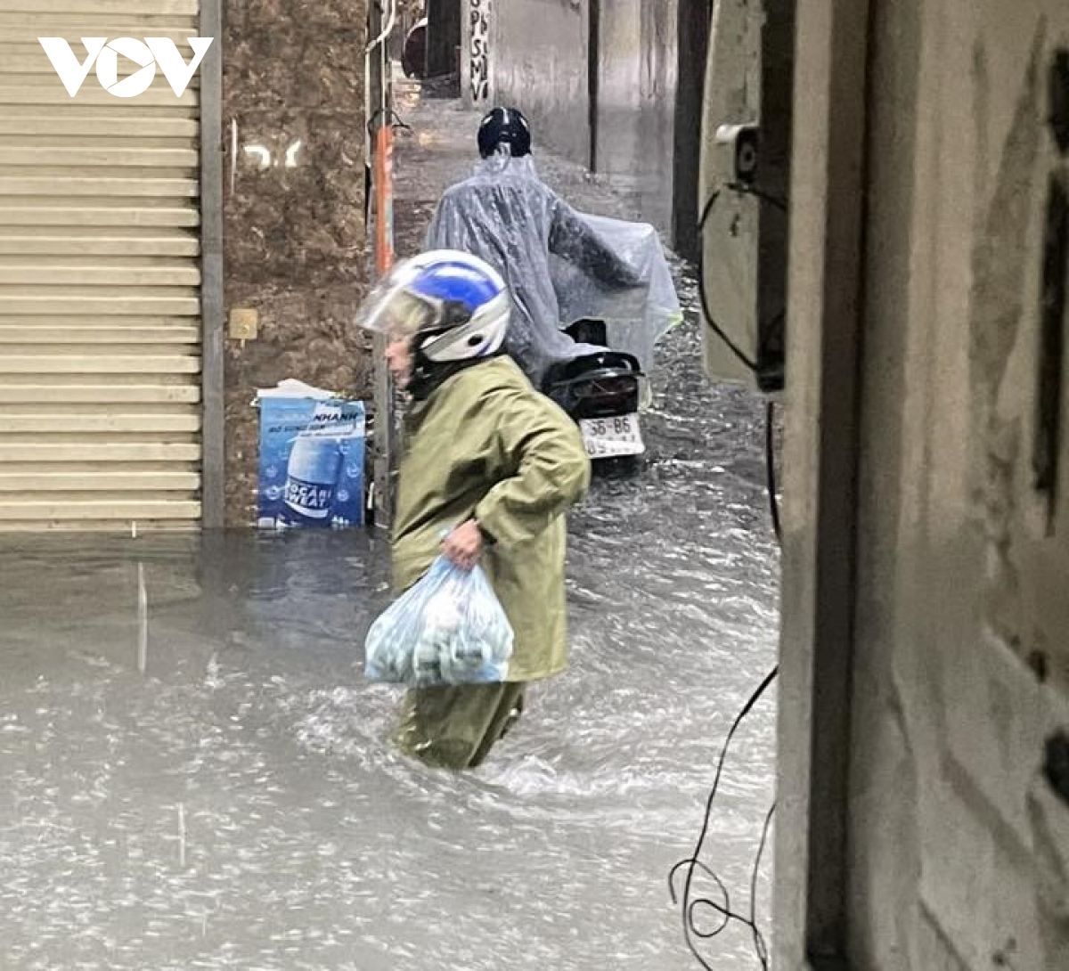 VOV.VN - Ảnh hưởng của bão số 5, cơn mưa lớn kéo dài không ngớt khiến nhiều tuyến phố Hà Nội ngập sâu như ao hồ. Người dân bì bõm tìm cách vượt qua biển nước.