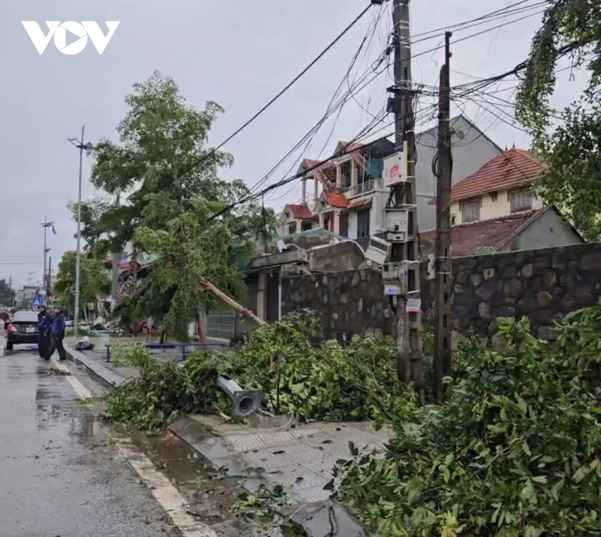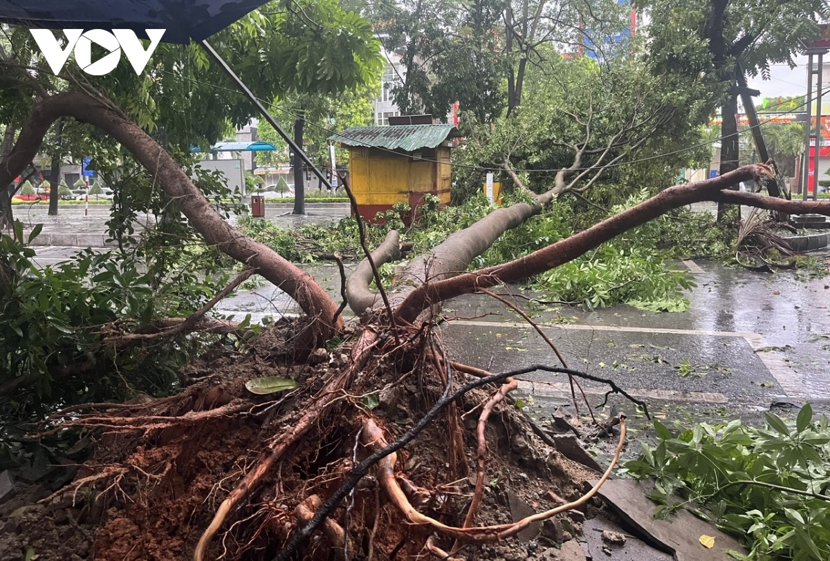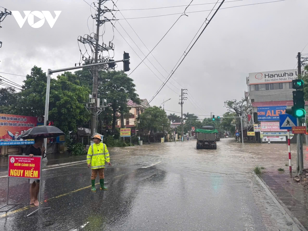 CTV Phương Giang/ VOV.VN tại Thanh Hóa cho biết, do ảnh hưởng của hoàn lưu bão số 5, mưa lớn kéo dài từ chiều 25/8 cho đến sáng 26/8, kèm theo gió mạnh, trên địa bàn tỉnh Thanh Hóa nhiều tuyến phố biến thành sông, cây bị bật gốc nằm la liệt gây cản trở cho các phương tiện tham gia giao thông
