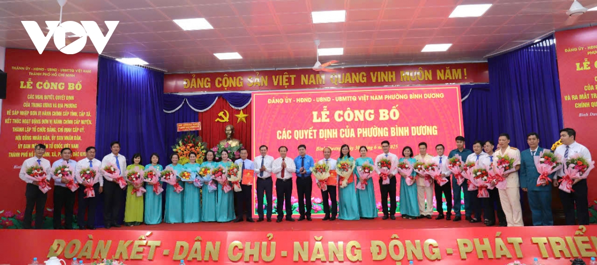 VOV.VN - Ngày 30/6, Lễ công bố các Quyết định, Nghị quyết của Tỉnh ủy và HĐND tỉnh về sáp nhập đơn vị hành chính đã diễn ra tại phường Bình Dương mới. Với diện tích hơn 58km² và dân số gần 108.000 người, "siêu phường" này được kỳ vọng sẽ là đô thị tiên phong, kiểu mẫu về đô thị thông minh của TP.HCM trong tương lai.