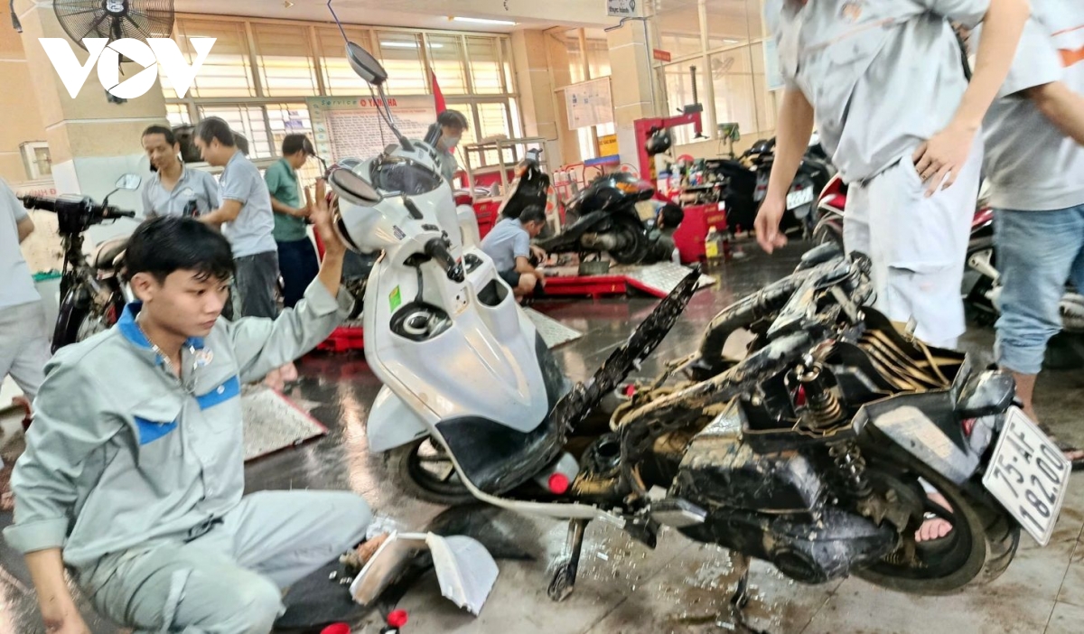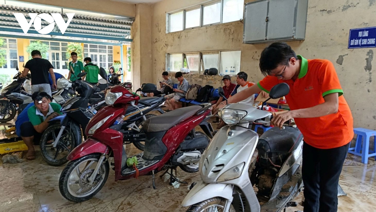 VOV.VN - Hai ngày qua, khuôn viên Trường Cao đẳng Công nghiệp Huế trở thành “xưởng sửa xe dã chiến” giữa lòng thành phố. Các tình nguyện viên, giáo viên và sinh viên từ Huế, Đà Nẵng cùng nhiều tỉnh thành khác miệt mài sửa chữa xe máy miễn phí cho người dân vùng ngập lụt.