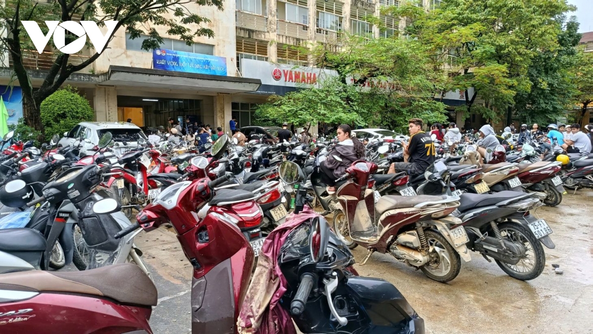 Xe máy ngập lụt được người dân đưa đến sân trường Cao đẳng Công nghiệp Huế chờ sửa miễn phí