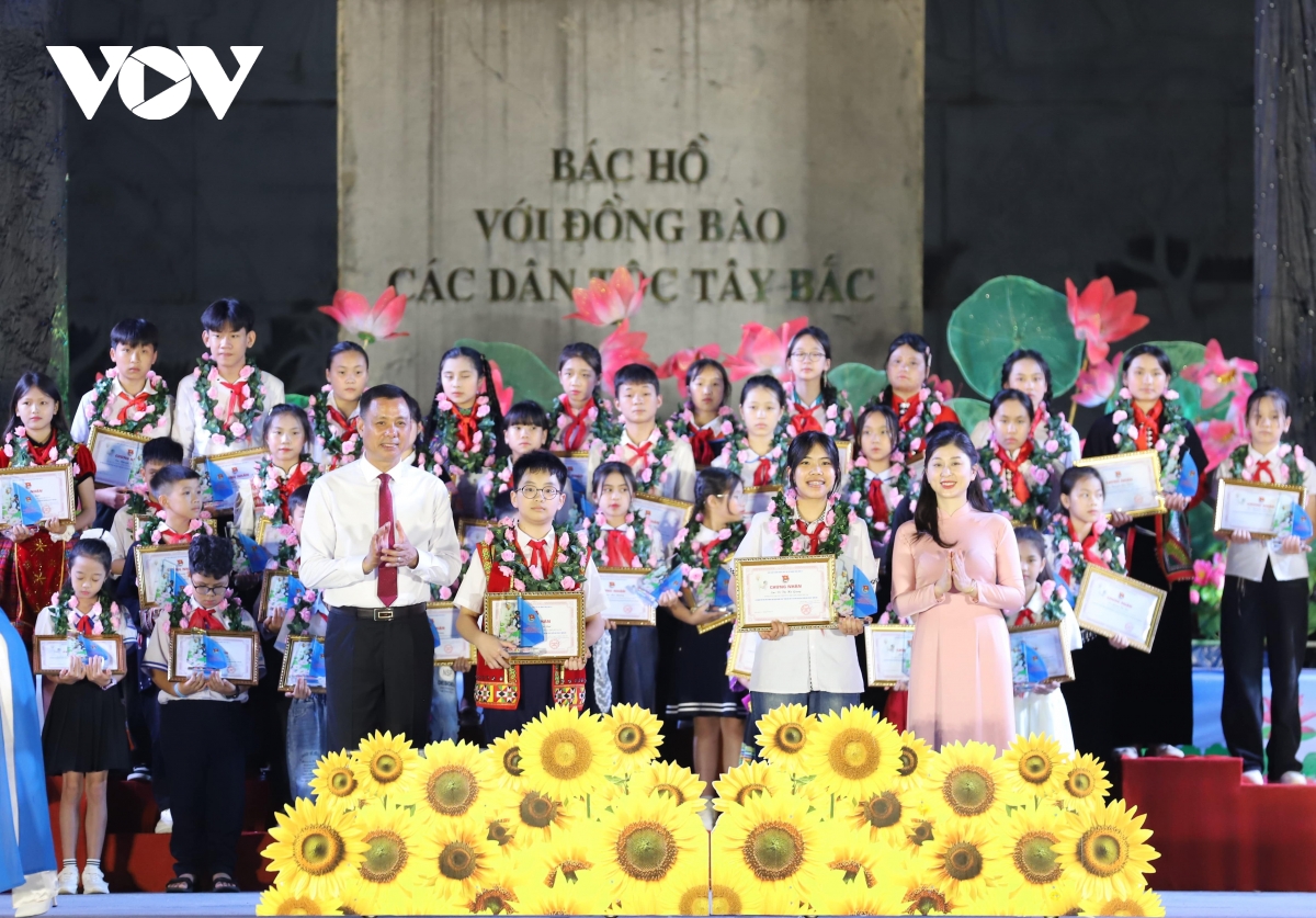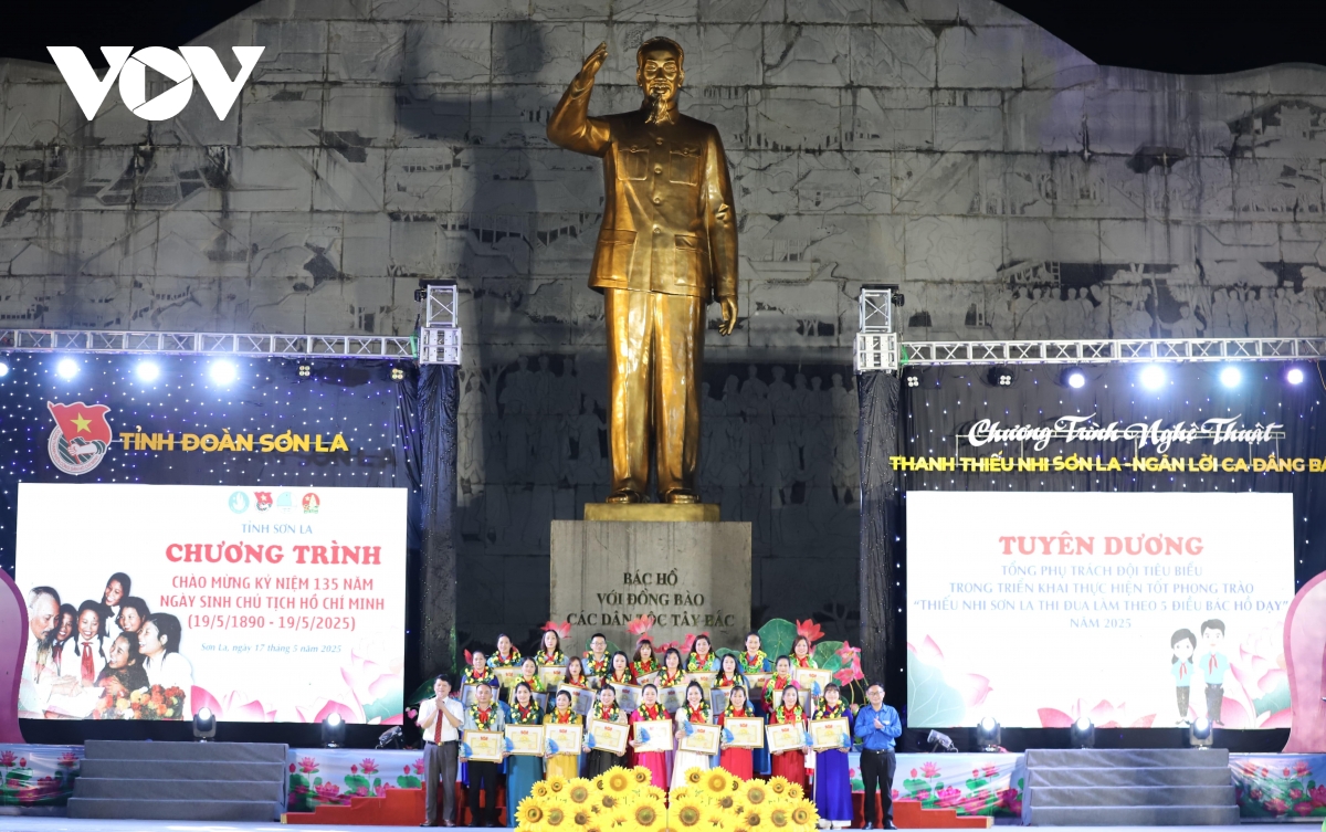 Bên Tượng đài Bác Hồ và đồng bào các dân tộc Tây Bắc, 60 thanh niên tiên tiến làm theo lời Bác và 75 cá nhân là thiếu nhi và tổng phụ trách đội tiêu biểu trong triển khai thực hiện phong trào “Thiếu nhi Sơn La thi đua làm theo 5 năm điều Bác Hồ dạy” năm 2025 của tỉnh Sơn La đã được tuyên dương.