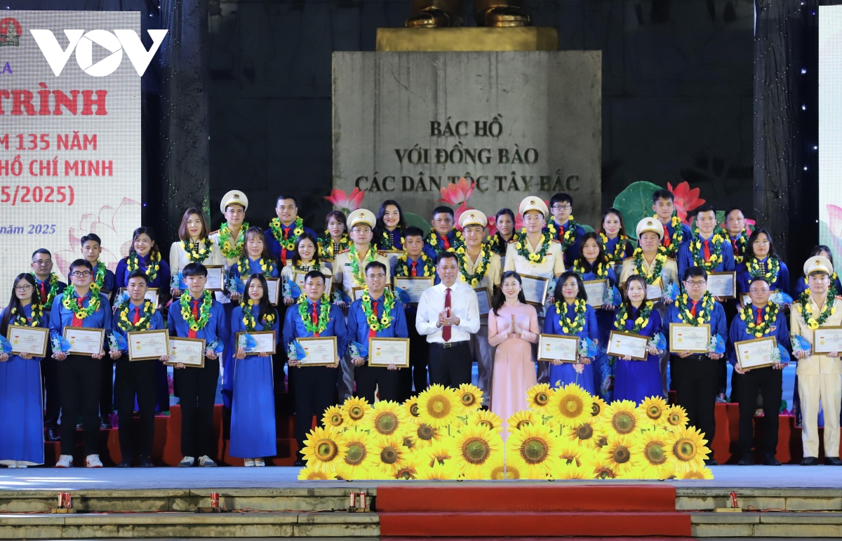VOV.VN - Chào mừng kỷ niệm 135 năm ngày sinh Chủ tịch Hồ Chí Minh, tối 17/5, tại Quảng trường Tây Bắc, TP Sơn La, Tỉnh Đoàn Sơn La đã tổ chức tuyên dương thanh thiếu nhi tiêu biểu và Chương trình nghệ thuật “Thanh thiếu nhi Sơn La - ngàn lời ca dâng Bác”.