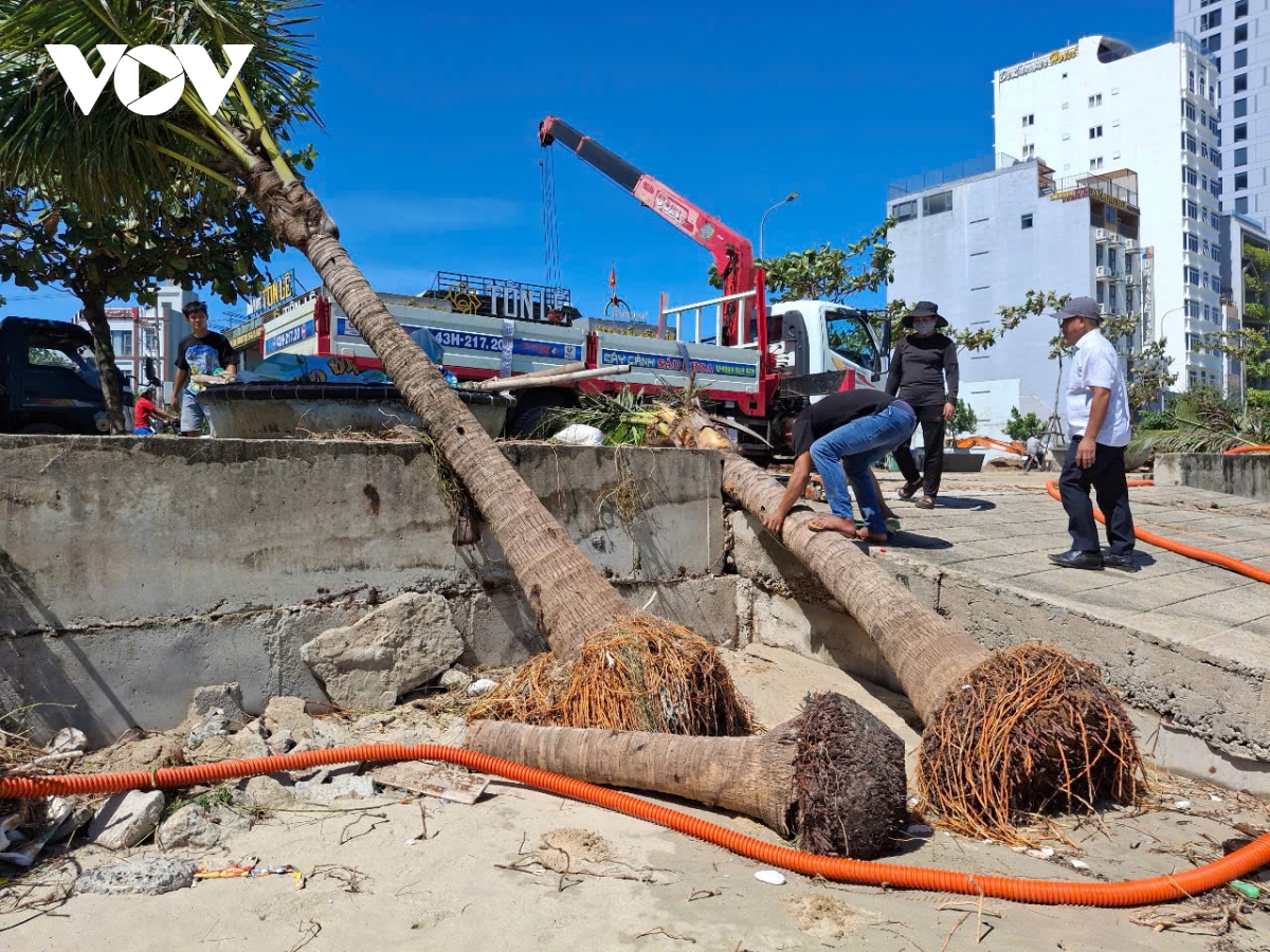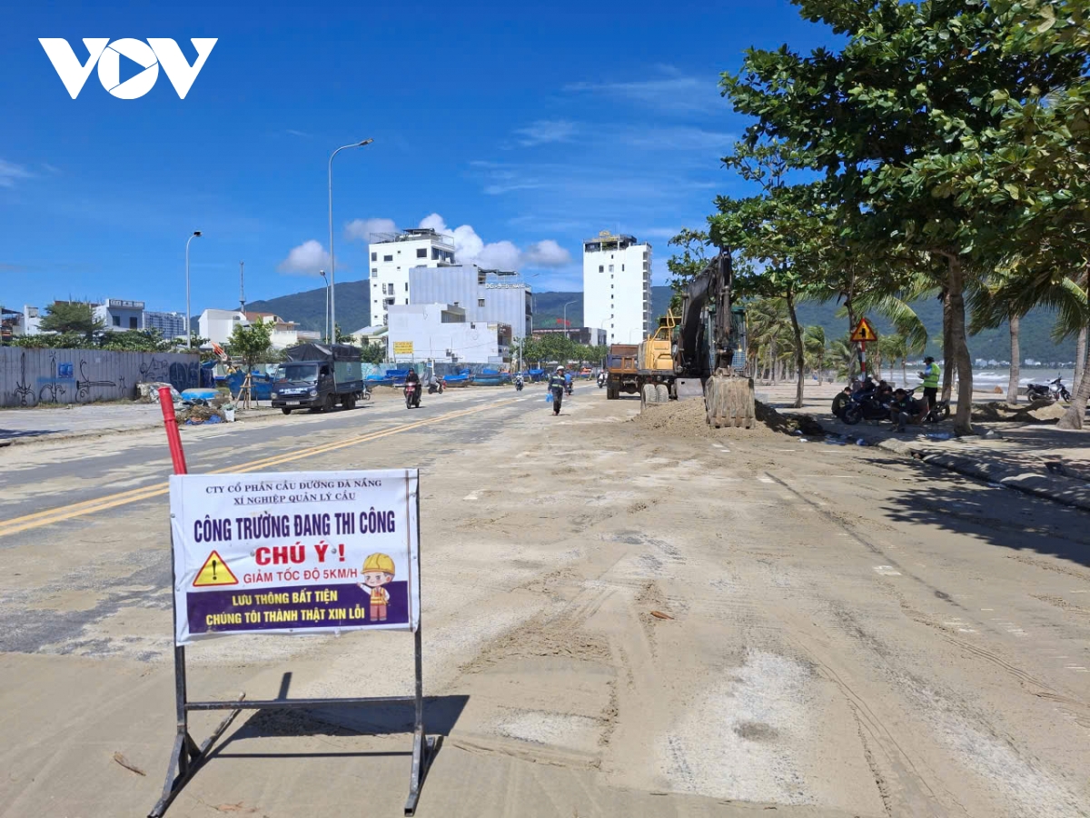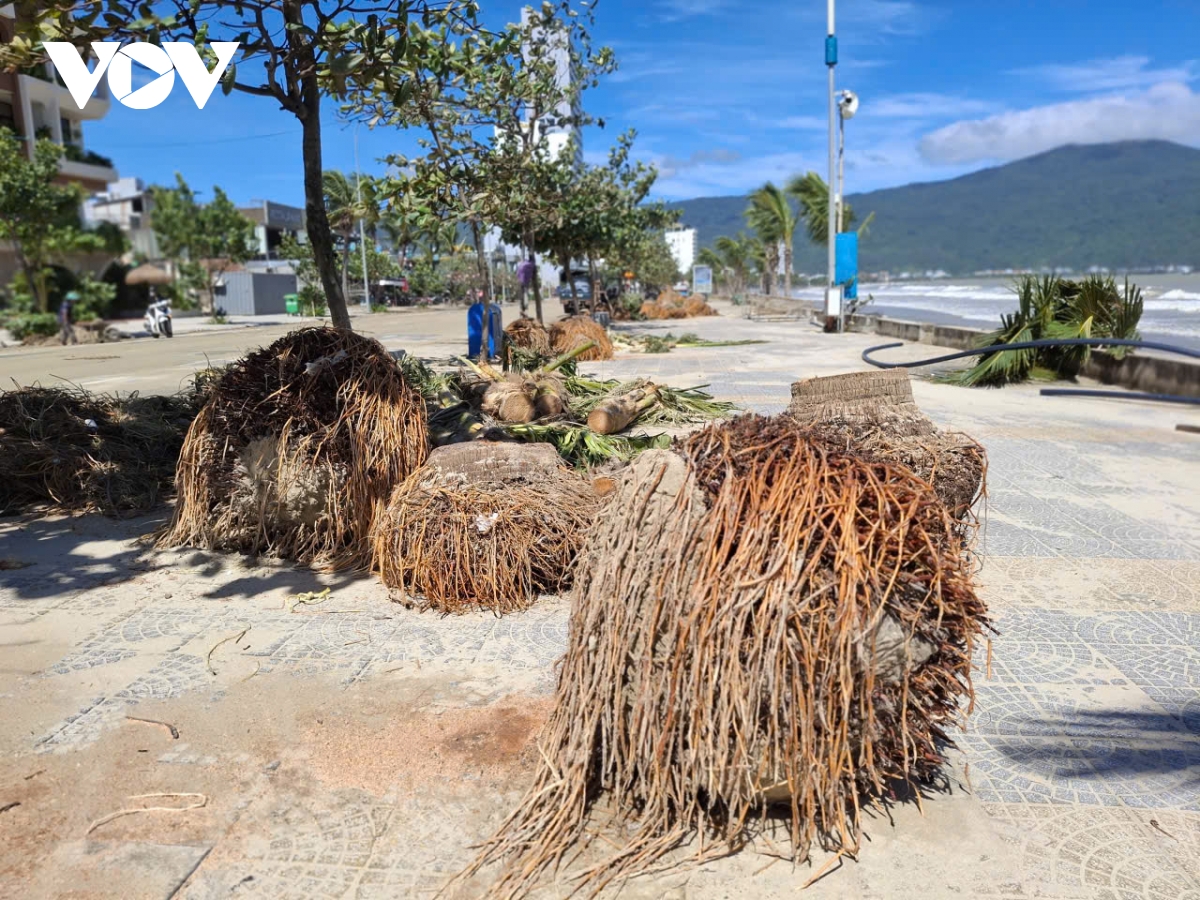 Nước biển dâng cao tràn qua tuyến đường ven biển Hoàng Sa - Võ Nguyên Giáp, cuốn theo cát và rác phủ dày mặt đường. Hơn 3km bãi biển dọc tuyến đường này cũng ngập tràn rác thải. Bờ kè bằng đá và bao tải đựng cát bảo vệ tại Công viên Cá Voi bị xói lở, ăn sâu vào đất liền. Hơn 200 cây dừa cảnh mới trồng dọc bãi biển o Mân Thái - Thọ Quang bị sóng đánh bật gốc, gãy đổ.