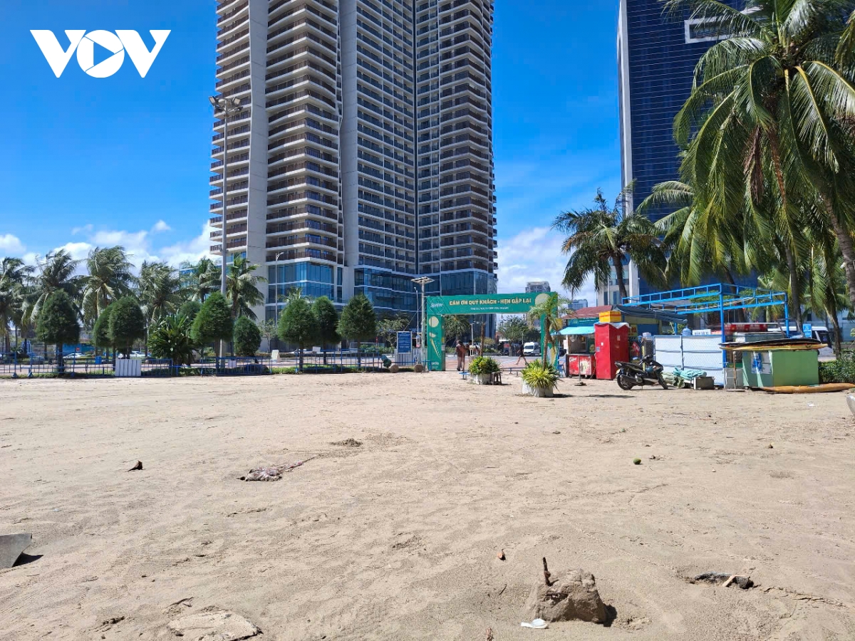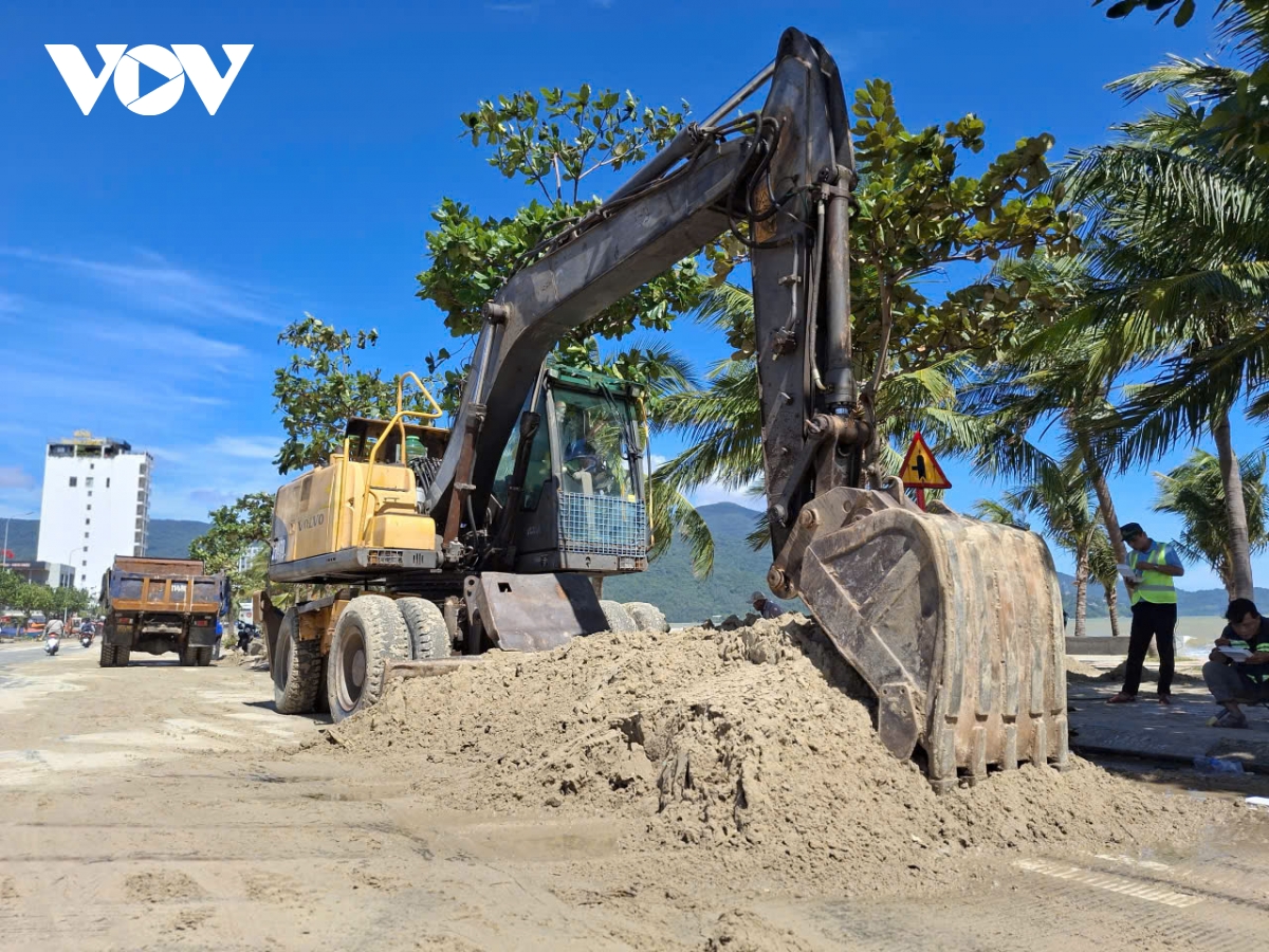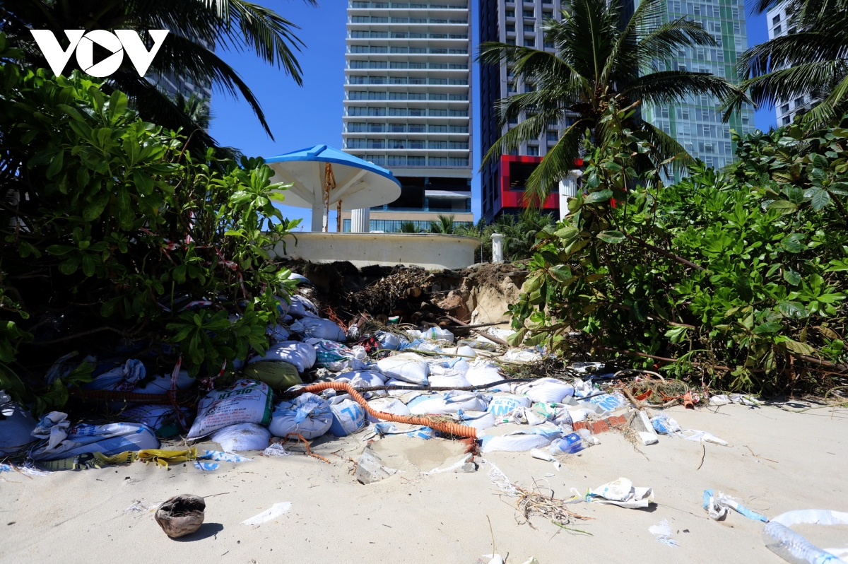Nước biển dâng cao tràn qua tuyến đường ven biển Hoàng Sa - Võ Nguyên Giáp, cuốn theo cát và rác phủ dày mặt đường. Hơn 3km bãi biển dọc tuyến đường này cũng ngập tràn rác thải. Bờ kè bằng đá và bao tải đựng cát bảo vệ tại Công viên Cá Voi bị xói lở, ăn sâu vào đất liền. Hơn 200 cây dừa cảnh mới trồng dọc bãi biển o Mân Thái - Thọ Quang bị sóng đánh bật gốc, gãy đổ.