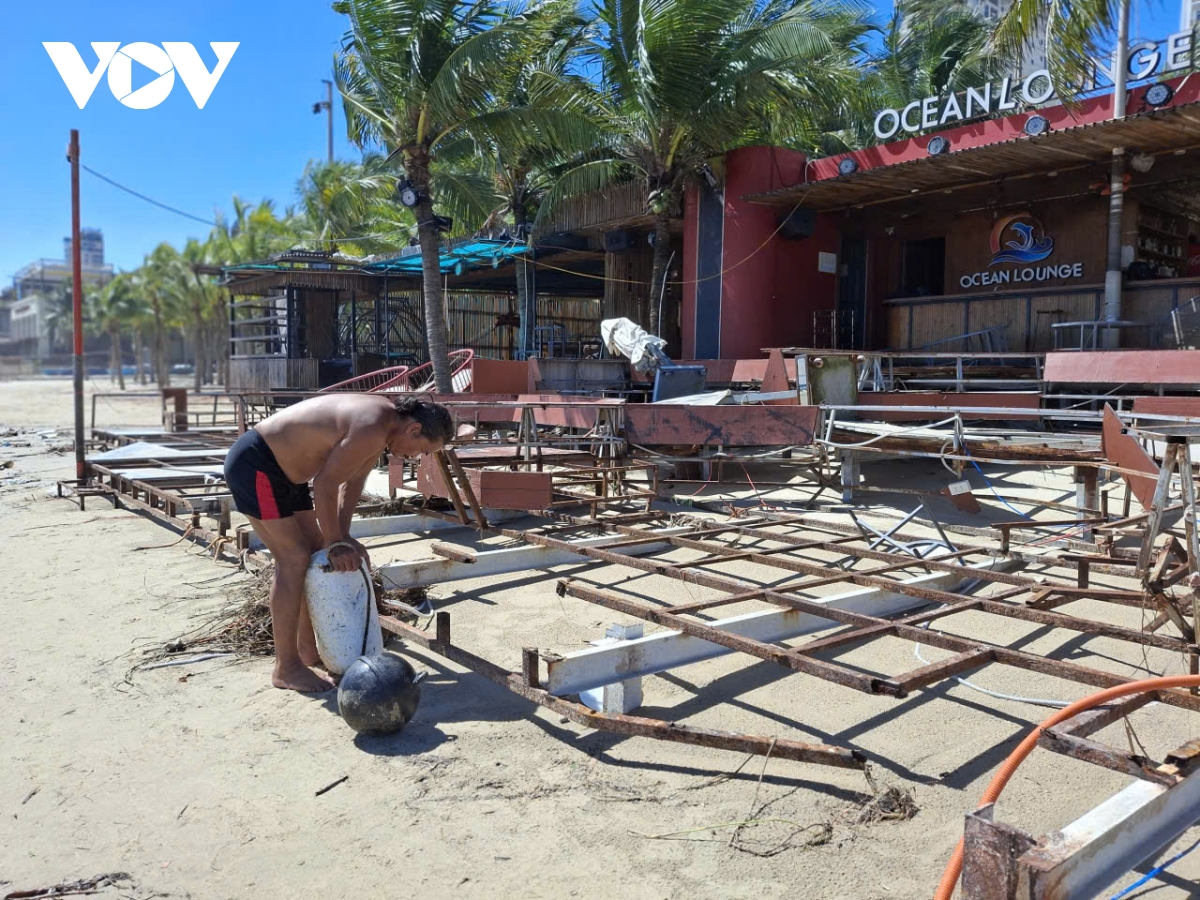 Anh Trần Quang Khải, quản lý điểm giữ xe, dịch vụ ăn uống, tắm nước ngọt tại bãi tắm Phước Mỹ rất bất ngờ khi sóng lớn và đánh mạnh như tối qua:“Tầm 20 giờ hôm qua là nước biển tràn lên đây rồi. Tôi không nghĩ sóng lớn như thế này. Sóng to làm bàn ghế bị hư hết rồi, bên trong quầy pha chế này cũng bị cát lấp, phải dọn dẹp. Giờ hư hại rất nhiều, tan hoang hết rồi, đang dọn dẹp lại quán”.