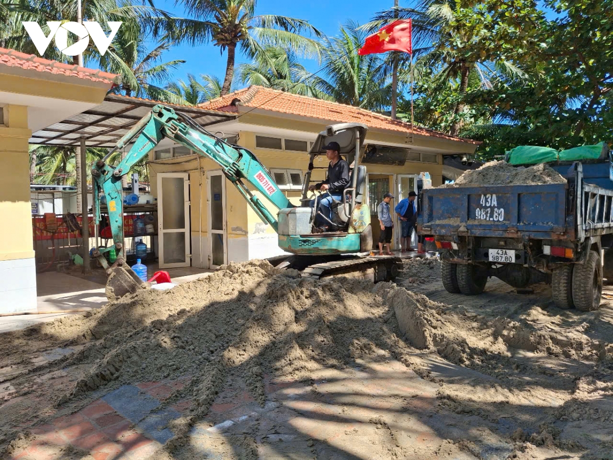 Ông Nguyễn Đức Vũ, Trưởng ban Quản lý bán đảo Sơn Trà và các bãi biển du lịch Đà Nẵng cho biết, trong sáng nay (7/11), đơn vị phối hợp với 2 phường Sơn Trà, An Hải, Công ty Môi trường đô thị và lực lượng Quân đội, Biên phòng khắc phục hậu quả bão số 13; tập trung thu dọn rác, đất cát tràn lấp mặt đường: “Ban đang khẩn trương cùng với các đơn vị, các lực lượng tại địa phương khẩn trương dọn dẹp, tổng vệ sinh và đưa số lượng cát tràn lên đường xuống lại bãi biển. Cây dừa bị ngã đổ cũng được thu dọn, vận chuyển đi nơi khác. Chúng tôi ưu tiên tập trung khắc phục các khu vực mà phục vụ khách du lịch. Trong thời gian từ chiều nay hoặc chậm nhất là đến sáng mai, chúng tôi sẽ cố gắng hoàn trả lại mặt bằng để đảm bảo phục vụ khách du lịch”.