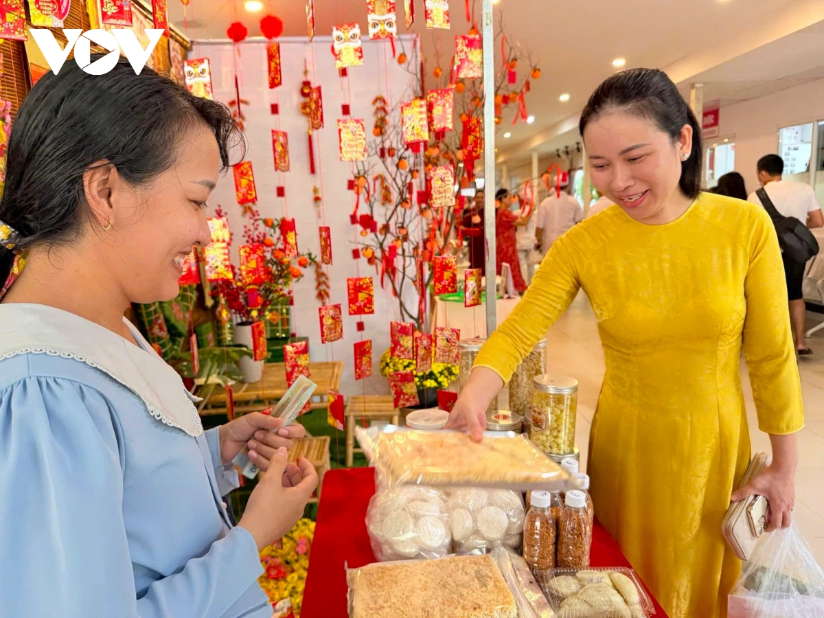 Chị Nguyễn Hoàng Nhã Trúc, sống tại tỉnh Kiên Giang, đang chờ sinh tại Bệnh viện Phụ sản TP. Cần Thơ và chị Lê Nguyễn Hồng Anh, khách hàng tham quan gian hàng Tết chia sẻ: “Gian hàng Tết ở đây trang trí bắt mắt, tươi đẹp, phù hợp với ngày Tết ở miền Tây - miền sông nước của mình. Bản thân tôi đang có bầu và dự sinh gần Tết thì cũng có không gian để vui chơi, tinh thần thoải mái hơn”.