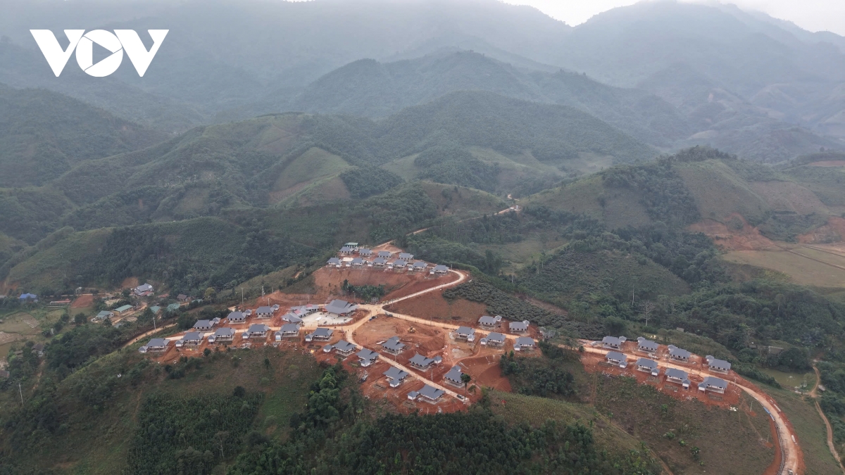 Sau màn sương mờ ảo, 40 căn nhà sàn khang trang, nằm vững chãi trên 3 tầng đồi. Mỗi căn nhà được gắn số thứ tự kèm tên gia chủ. Đây là nơi cư ngụ của 33 hộ dân Làng Nủ sau thảm họa lũ quét, lở núi kinh hoàng vùi lấp cơ man nhà cửa, tài sản, khiến 67 người chết và mất tích hồi đầu tháng 9/2024.