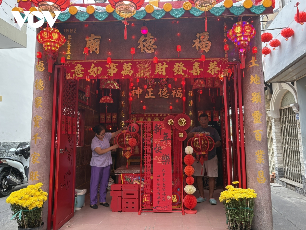 Không chỉ là không gian ngày Tết, khu phố 11 còn có miếu Phước Đức lâu đời. Trước cửa miếu, người dân trong khu phố thường tụ tập, trò chuyện, chia sẻ cùng nhau trong những ngày Tết.