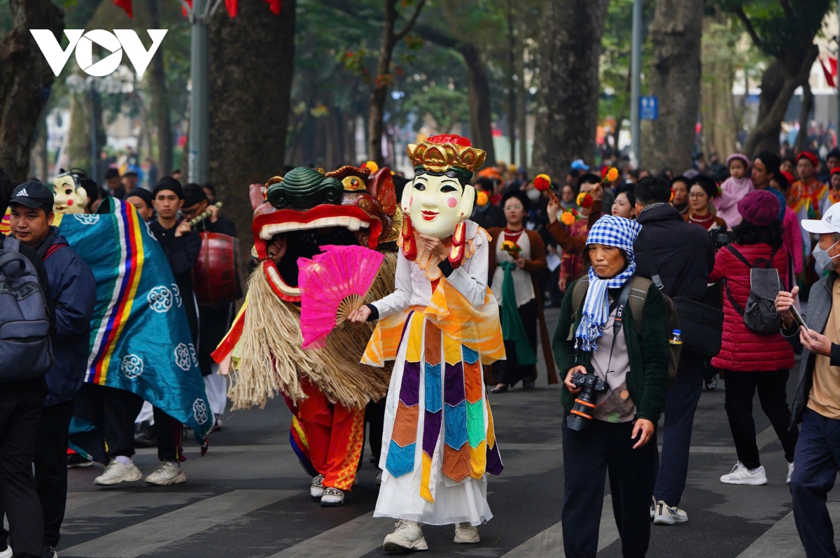 Xuất phát từ 50 Đào Duy Từ, đoàn rước lễ với hàng trăm người trong trang phục truyền thống đi qua các địa điểm nổi tiếng của hồ Hoàn Kiếm và Phố cổ Hà Nội như Ô Quan Chưởng, Quảng trường Đông Kinh nghĩa thục, không gian đi bộ hồ Hoàn Kiếm...Lễ vật của đoàn rước là những vật phẩm truyền thống ở Hà Nội ngày Tết như: mứt tết, trà sen, bánh chưng, bánh cốm, hoa đào, lợn quay…Đi cùng đoàn rước là điệu múa nghê tươi vui thu hút sự chú ý của người dân và du khách.
