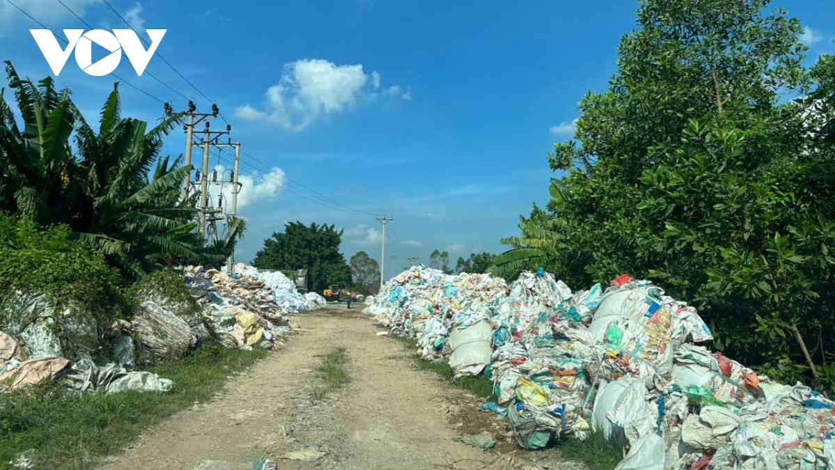 Dọc hai bên đường khu vực đi vào núi gần thôn Thái Phong và bên trong các bãi tập kết của cơ sở tái chế là những cuộn bao bì, dây nhựa chất đống, không được phân loại và xử lý đúng cách, tạo ra mùi hôi khó chịu.