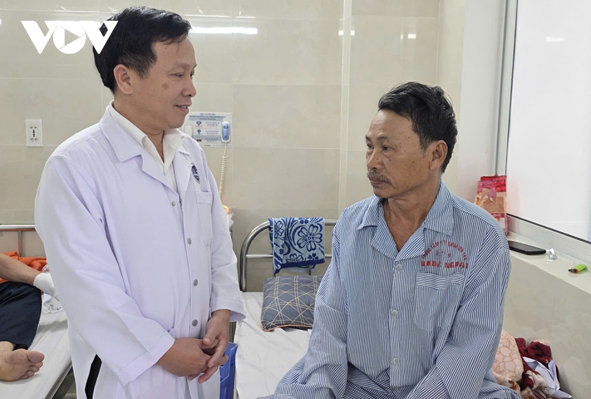 Bác sĩ Huỳnh Quốc Tám, Trưởng khoa Ngoại tổng hợp, Trung tâm y tế khu vực Sơn Trà hỏi thăm sức khỏe ông Phan Công Hoàng Anh sau phẫu thuật