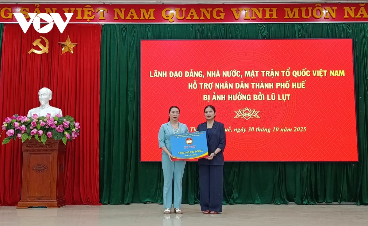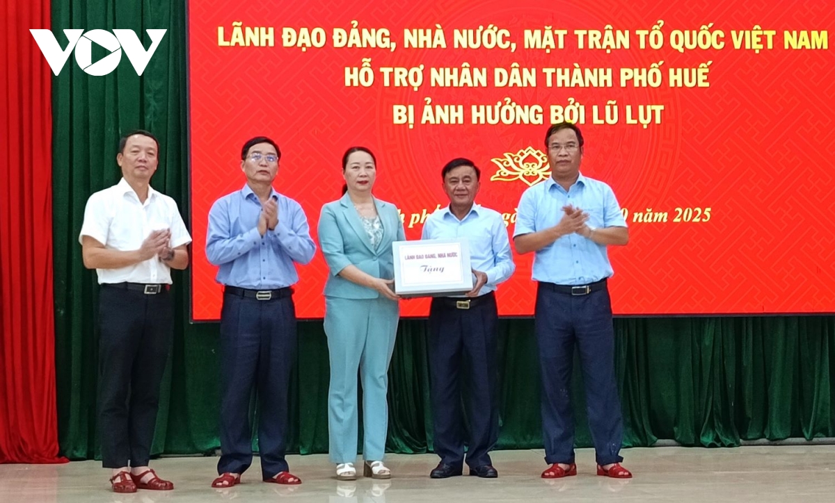 Dịp này, bà Hà Thị Nga, Phó Chủ tịch Uỷ ban Mặt trận Tổ quốc Việt Nam trao 5 tỷ đồng của Ban Vận động cứu trợ Trung ương hỗ trợ nhân dân và các lực lượng thành phố Huế.