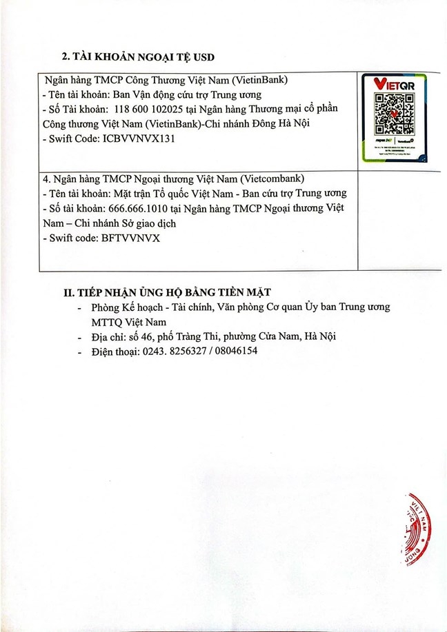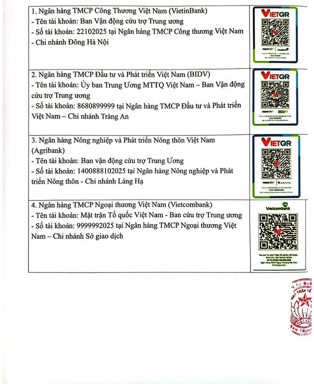 Trong điều kiện nguồn ngân sách nhà nước còn hạn chế, phát huy truyền thống đoàn kết quý báu của dân tộc, với tinh thần “tương thân tương ái”, “lá lành đùm lá rách”, Đoàn Chủ tịch Ủy ban Trung ương MTTQ Việt Nam kêu gọi đồng bào và chiến sĩ cả nước, đồng bào ta ở nước ngoài, các cơ quan, tổ chức, các doanh nghiệp, các nhà hảo tâm ở trong và ngoài nước, người nước ngoài đang sinh sống, làm việc ở Việt Nam… sẻ chia, giúp đỡ về tinh thần, vật chất, góp phần cùng với Đảng, Nhà nước hỗ trợ nhân dân khắc phục thiệt hại do bão, nhanh chóng khôi phục sản xuất và ổn định đời sống.