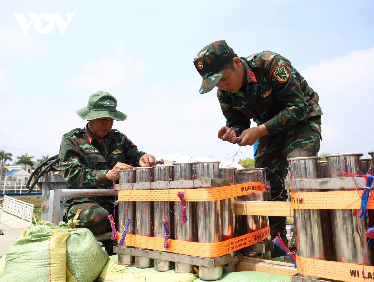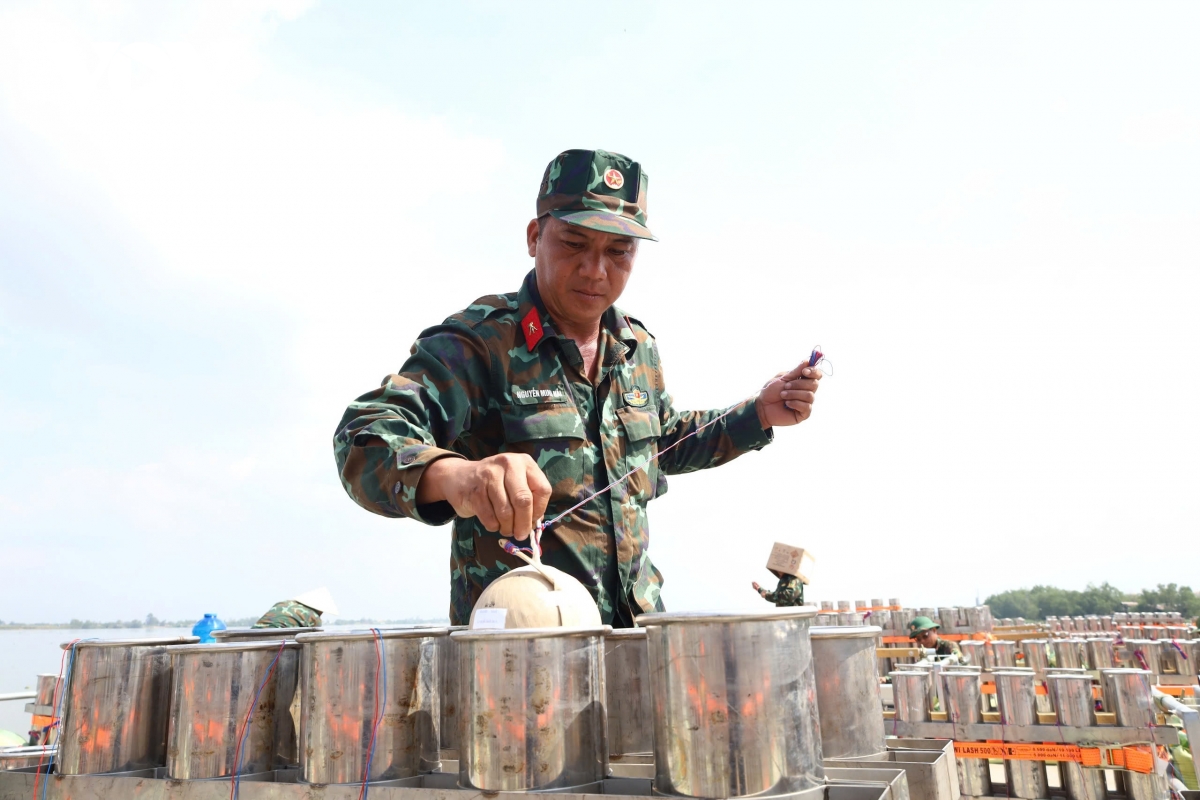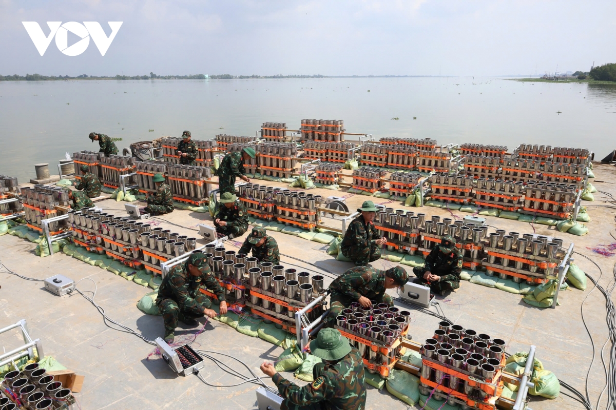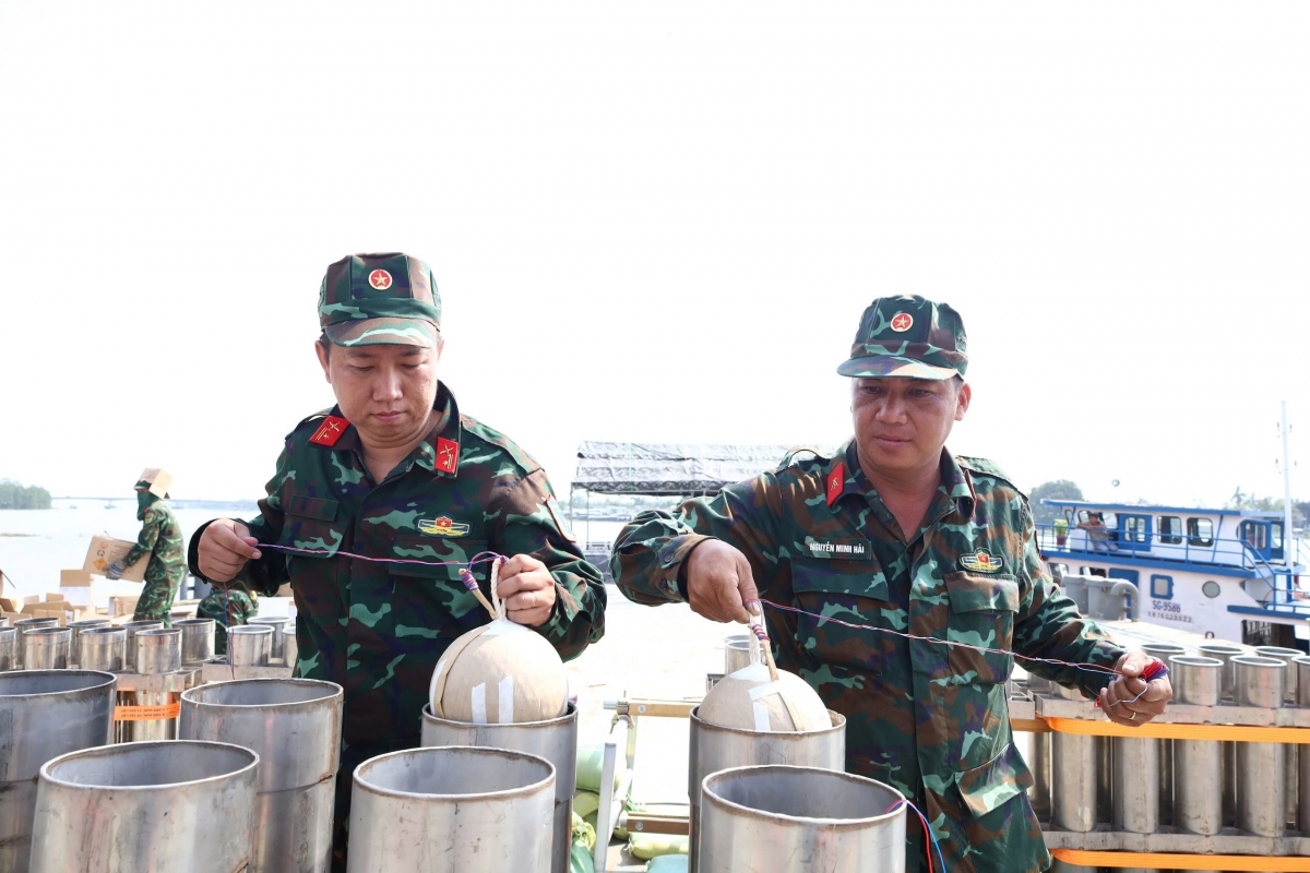 Để chuẩn bị cho màn pháo hoa đêm Giao thừa, những ngày qua, cán bộ, chiến sĩ Bộ CHQS TP. Cần Thơ đã triển khai lắp đặt trận địa pháo hoa tầm cao và địa điểm bắn trên sà lan tại ngã ba sông Cần Thơ, thuộc phường Cái Khế, quận Ninh Kiều.