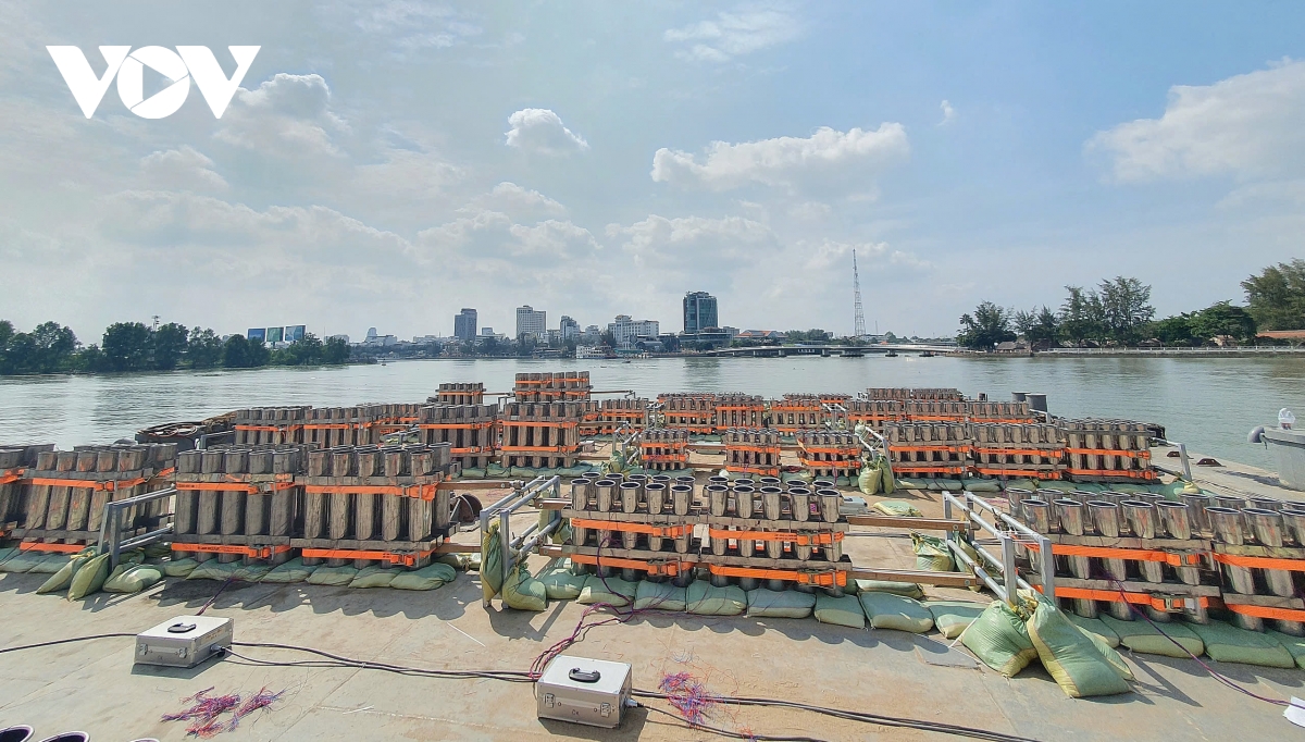 Trận địa pháo hoa tầm cao được lắp trên chiếc sà lan có trọng tải khoảng 2.000 tấn, dài 60m, do Công ty cổ phần bê tông 620 Châu Thới (tỉnh Vĩnh Long) hỗ trợ.