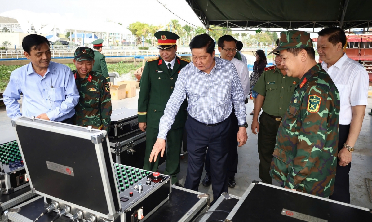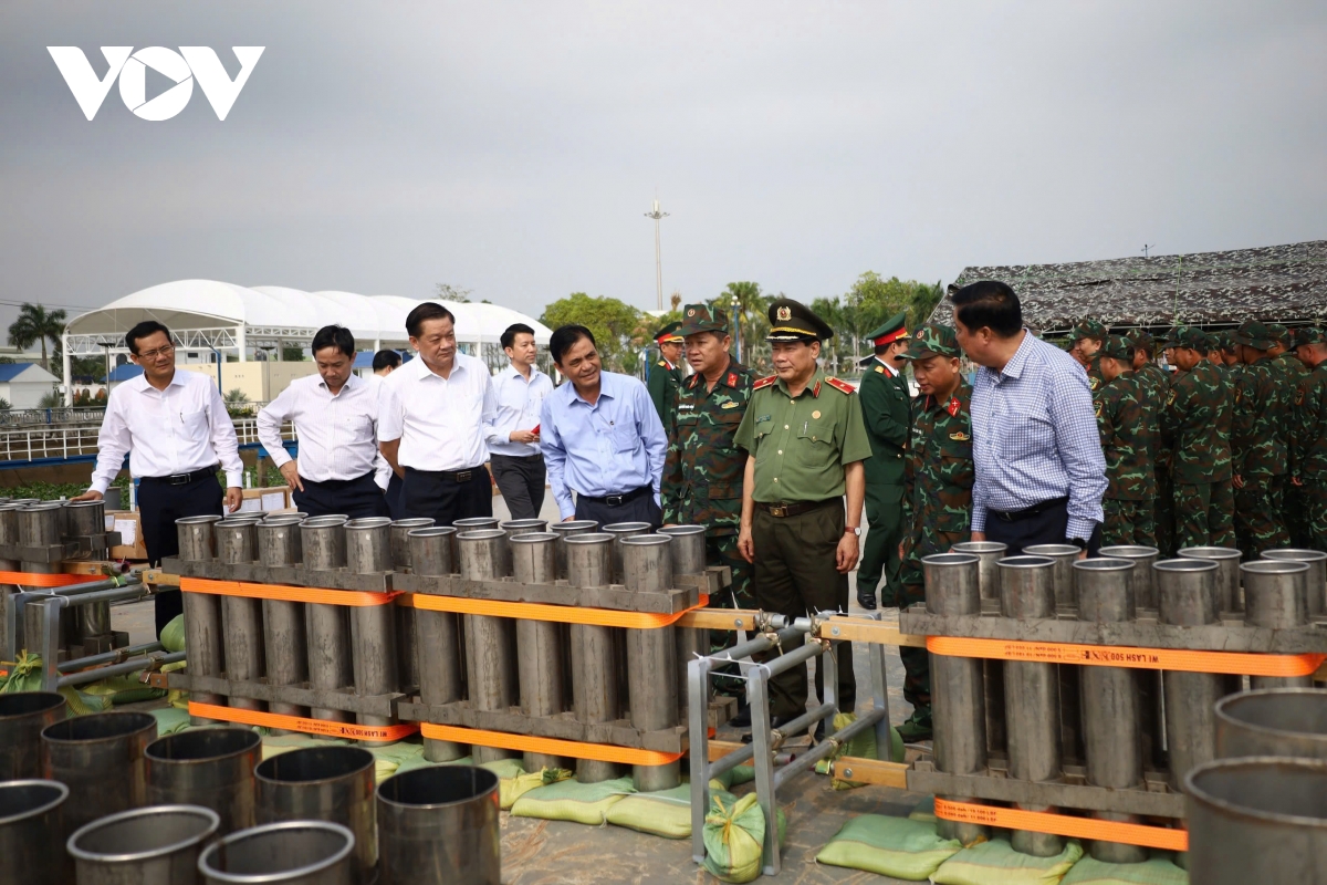 Ông Phạm Văn Hiểu, Phó Bí thư thường trực Thành ủy Cần Thơ kiểm tra khâu chuẩn bị tại trận địa pháo hoa tầm cao và địa điểm bắn trên sà lan.