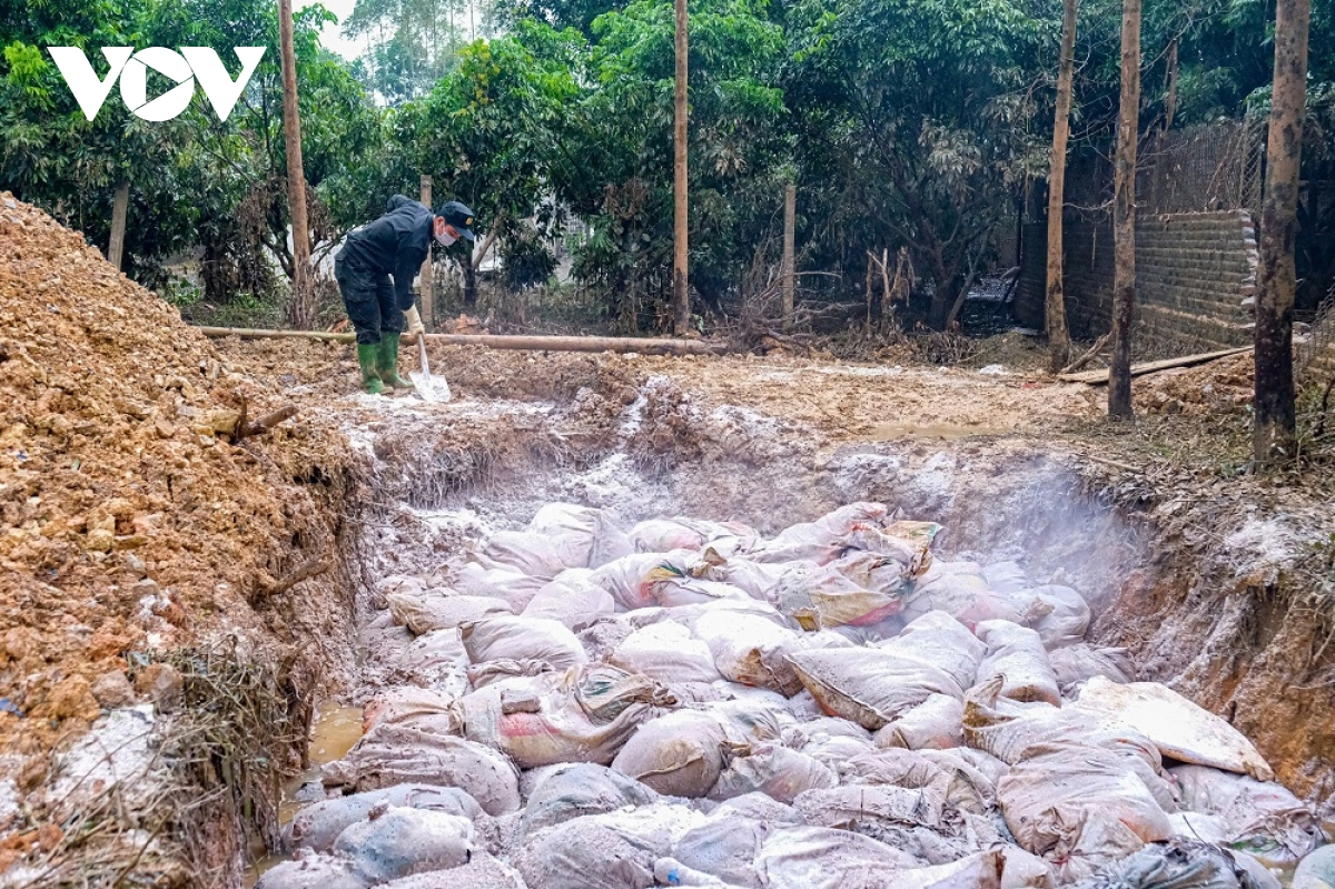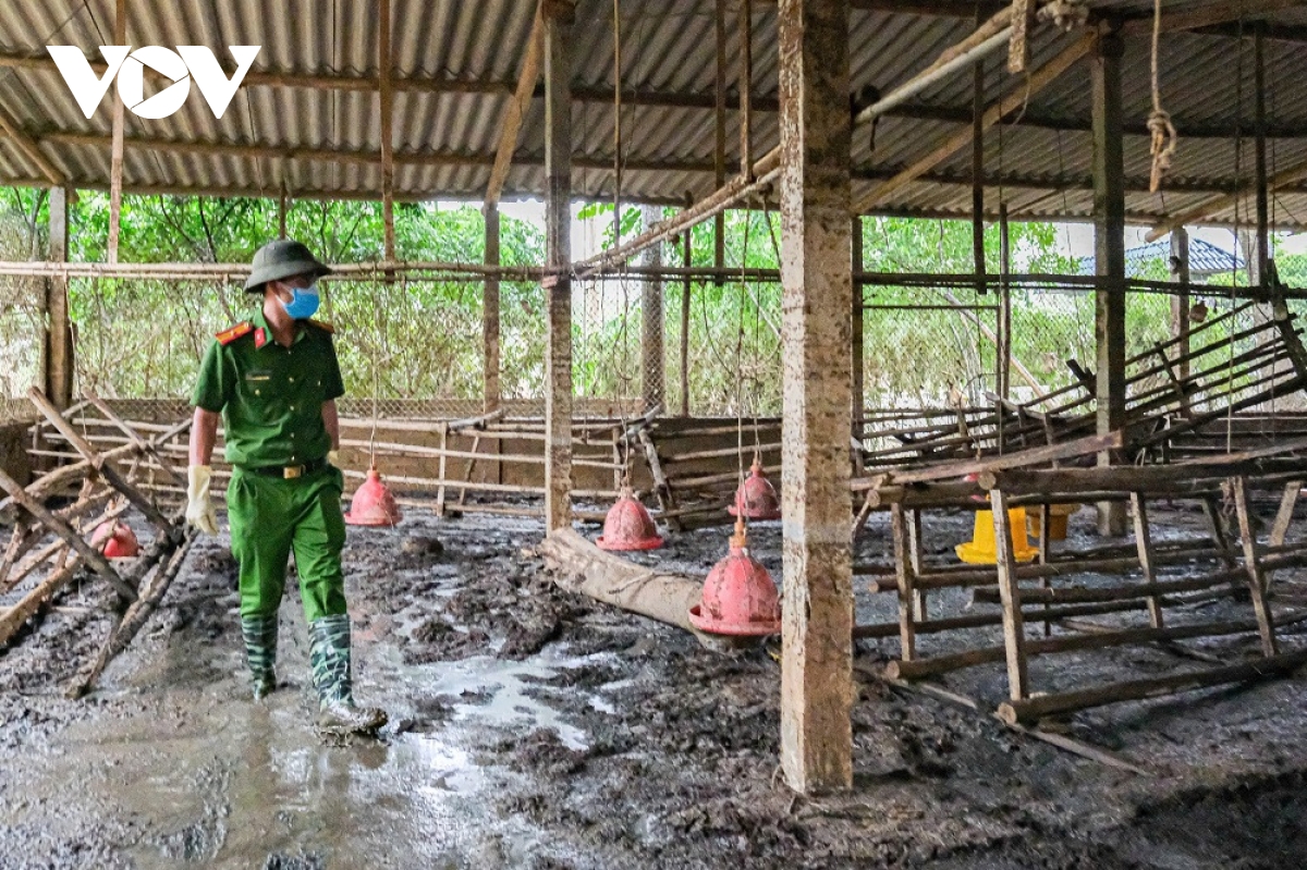 Sơ bộ đến ngày 14/10, lực lượng công an đã dọn dẹp, thu gom hàng chục nghìn con gà chết, 300-400 heo chết, sau đó đóng bao, đưa đi chôn lấp, rắc vôi bột, đảm bảo không lây lan dịch bệnh, ô nhiễm môi trường.