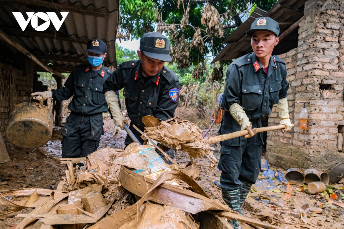 Lực lượng cảnh sát cơ động giúp người dân dọn dẹp nhà cửa sau bão lũ