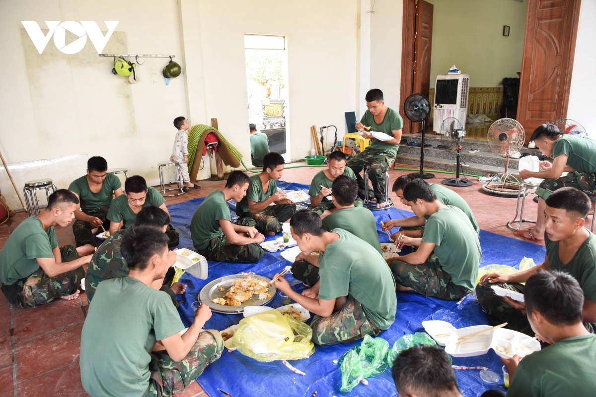 “Thời gian qua, từ khi bão đổ bộ vào, cán bộ, chiến sĩ thường xuyên cơ động đến các vị trí như tại xã Hợp Thịnh. Thực tế, có những người đã 2 ngày, 2 đêm chưa được nghỉ song mỗi người đều xác định rõ, luôn cố gắng ăn tranh thủ, ngủ khẩn trương, sẵn sàng tinh thần tiếp tục lao động, hỗ trợ nhân dân củng cố, khắc phục sự cố đê điều, đảm bảo an toàn nhất cho bà con”, Trung tá Bùi Anh Minh, cho biết.