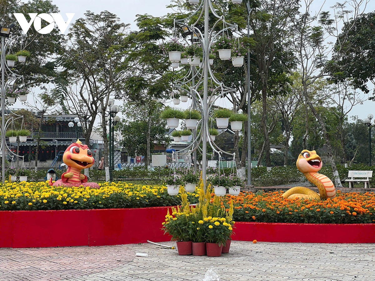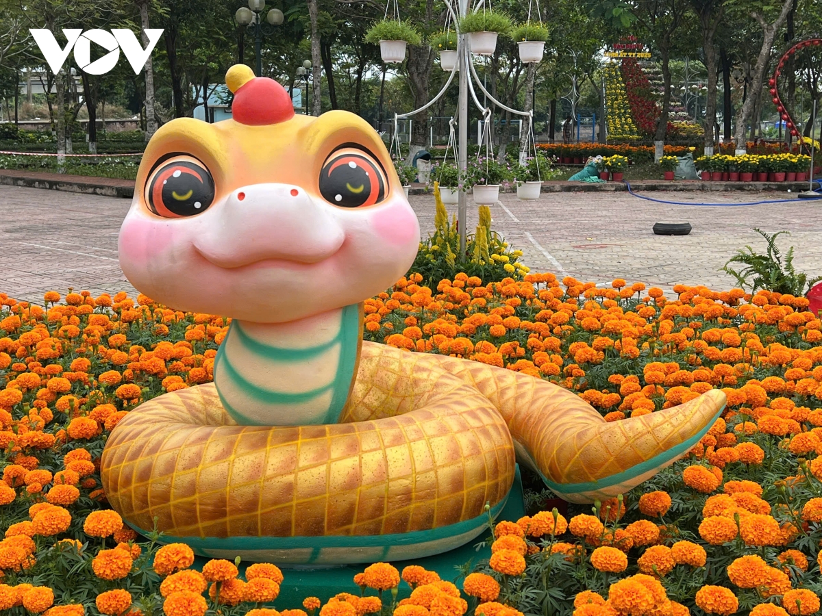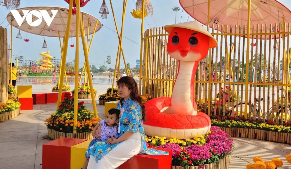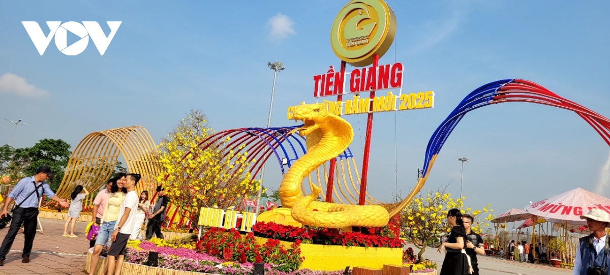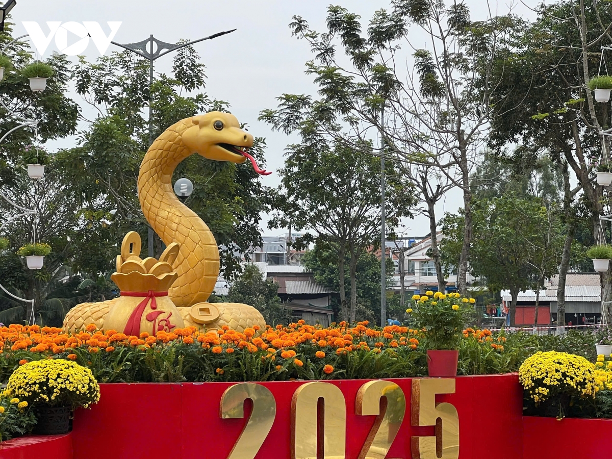 VOV.VN - Chào mừng Xuân Ất Tỵ 2025, tại các địa phương trong tỉnh Tiền Giang đều có xây dựng cổng chào, đường hoa, tiểu cảnh… đa dạng sắc màu; trong đó linh vật rắn giữ vai trò chủ đạo, thu hút người dân đến xem, chụp ảnh lưu niệm.
