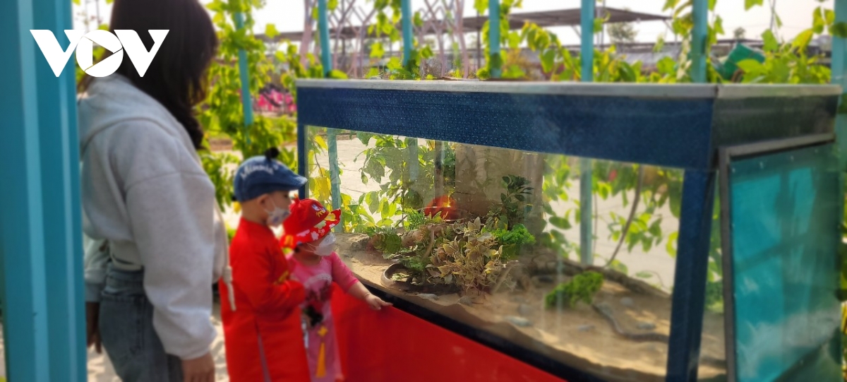 Đường hoa và Chợ hoa Xuân Ất Tỵ 2025 tại Quảng trường Hùng Vương (xã Đạo Thạnh, TP. Mỹ Tho) là nơi “xuất hiện” rất nhiều loại rắn thật, “rắn giả” rất độc, lạ kỳ thú, thu hút đông khách tham quan, thưởng lãm.