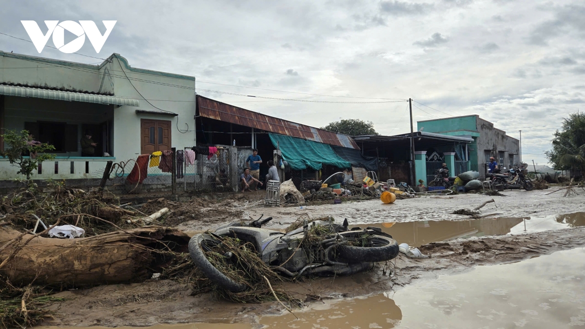 Bùn đất ngập lối, nhà cửa nghiêng ngả, tường rào bị đánh sập, xe máy và đồ đạc nằm chồng chất trong lớp bùn đặc quánh. Đó là những gì còn sót lại ở thôn 2, xã Tuy Phong sáng nay. Cảnh tượng ấy giống như một bãi chiến trường sau lũ. Ông Lê Minh Hải, người dân địa phương, cho biết con đập ở thượng nguồn được một doanh nghiệp tự đắp bằng đất, cao hàng chục mét, dùng để trữ nước tưới cây. Và đêm qua – chính con đập đó đã vỡ tung.