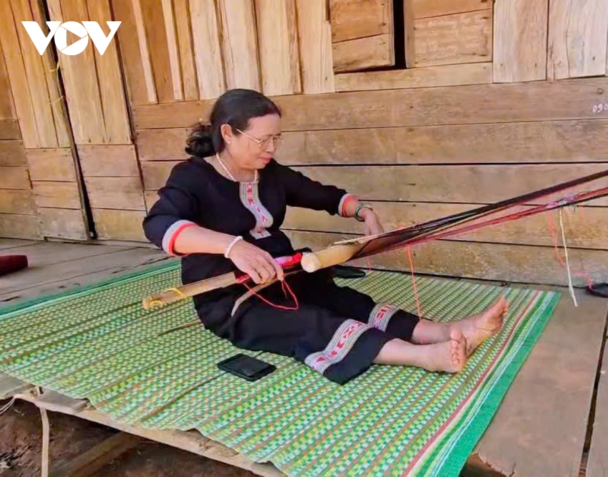 Bà H'Yam Buôn Krông vừa đệt thổ cẩm, vừa nghe Đài qua điện thoại