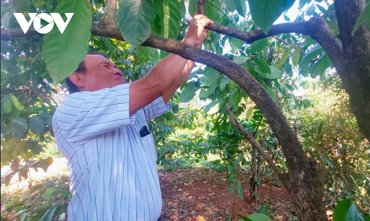 Giữa rẫy cà phê đang vào vụ chăm sóc, chiếc điện thoại được ông Y Nguyên Buôn Krông, Buôn trưởng buôn Cư Mblim, phường Ea Kao, tỉnh Đắk Lắk mang theo bên mình.