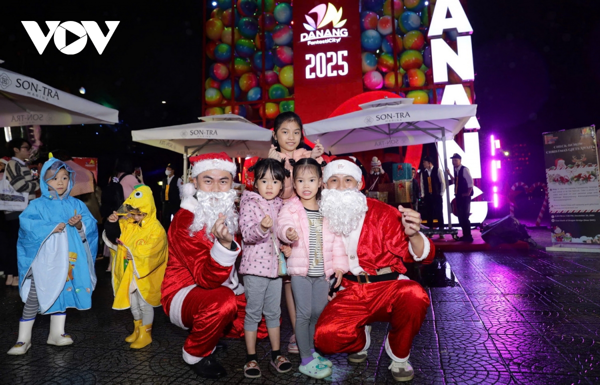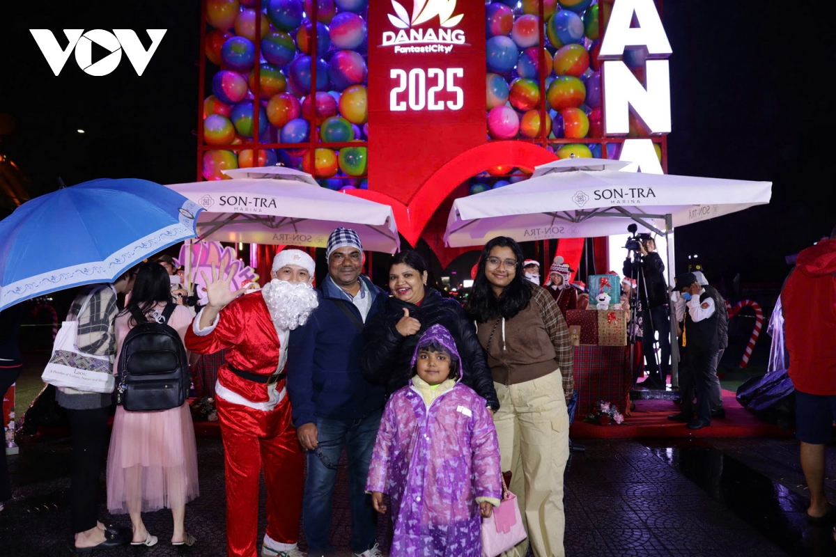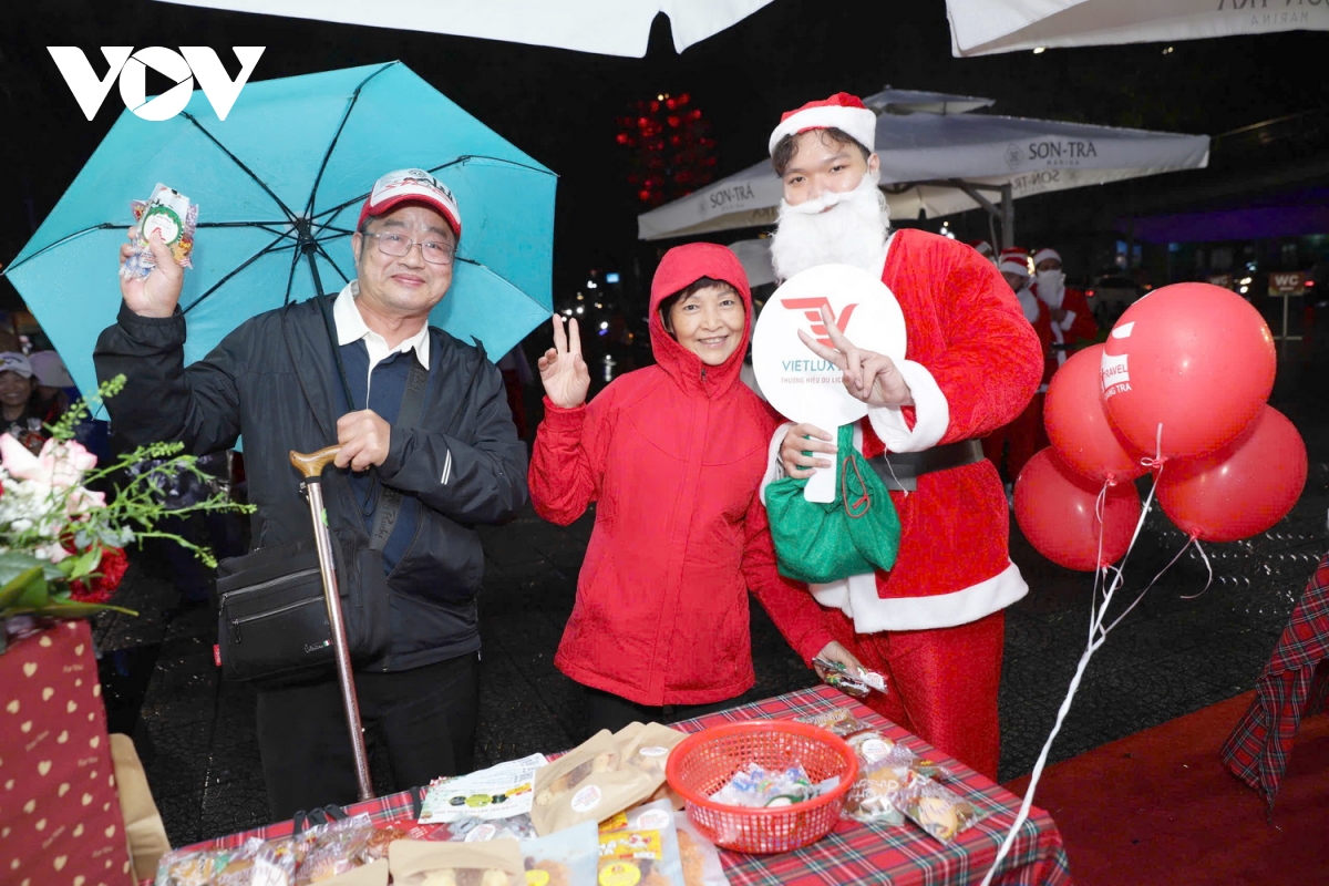 Dù trời mưa lạnh nhưng khá đông người dân thành phố Đà Nẵng và khách du lịch đến công viên bờ Đông Cầu Rồng, bờ Đông sông Hàn để vui cùng ông Già Noel trong đêm Giáng Sinh và tham quan trải nghiệm các món ăn tại Phiên chợ Đón Giáng sinh – Chào năm mới Đà Nẵng 2025.