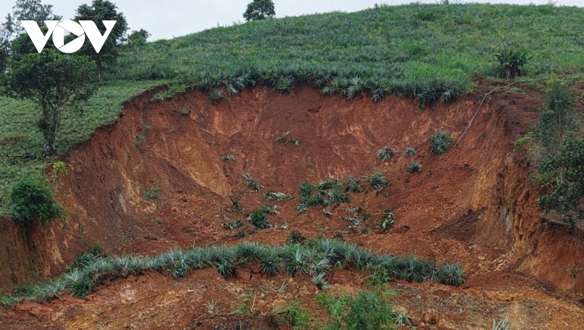 Gần một tuần sau trận lũ lịch sử, 7 héc ta dứa của gia đình chị Trần Thị Huyền, trên triền đồi thôn 2, xã Yang Mao, chỉ còn lại những khoảng đất nham nhở. Nhiều mảng dứa bị sạt trượt vùi lấp, xen kẽ với những rãnh xói lở sâu, kéo dài hàng trăm mét.