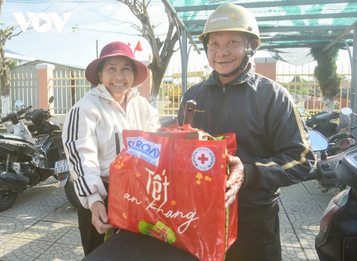 Ông Lê Tấn Minh, Chủ tịch Hội Chữ thập đỏ thành phố Đà Nẵng cho biết: Ngày cận Tết, các Hội, đoàn thể ở thành phố Đà Nẵng mang theo hàng ngàn phần quà, gồm bánh mứt, gạo ăn, chăn mền, đồ dùng gia đình và nhiều mặt hàng thiết yếu đến trao tận tay bà con vùng chịu ảnh hưởng thiên tai, giúp người dân đón Tết vui tươi, phấn khởi.
