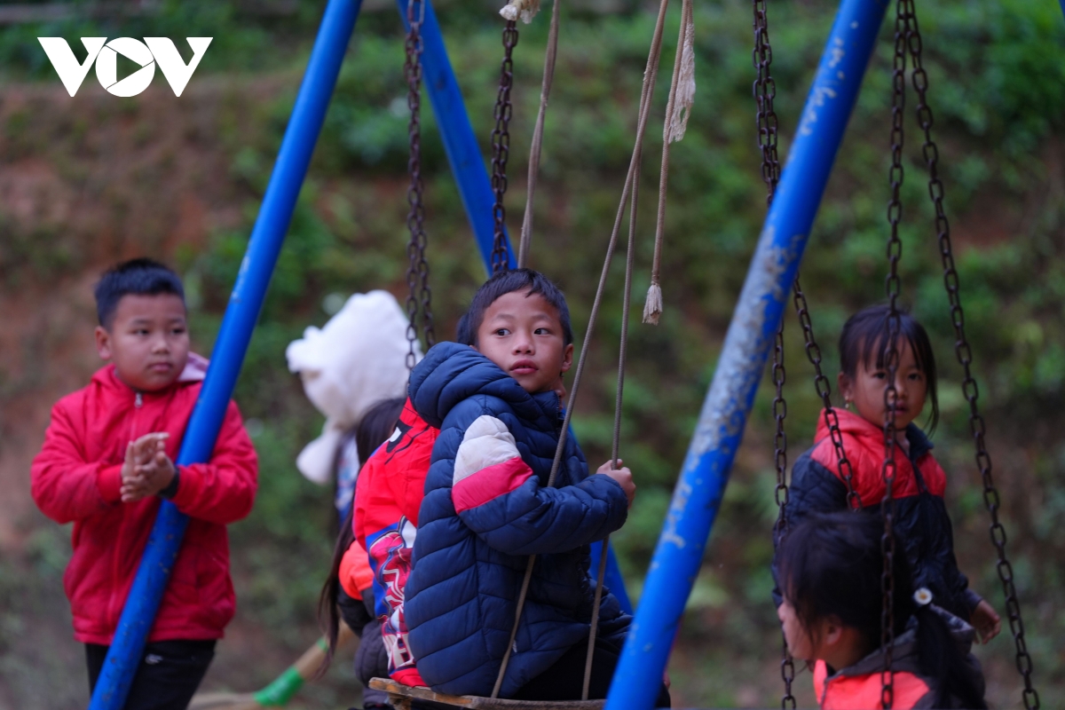 Giờ giải lao, sân điểm trường Mùa Xuân, xã Xuân Thủy rộn ràng tiếng cười. Trên chiếc xích đu đơn sơ, ánh mắt trẻ thơ trong veo, lấp lánh niềm vui. Mỗi vòng đưa cao là một ước mơ bay lên giữa núi rừng, thắp sáng tuổi thơ vùng cao.